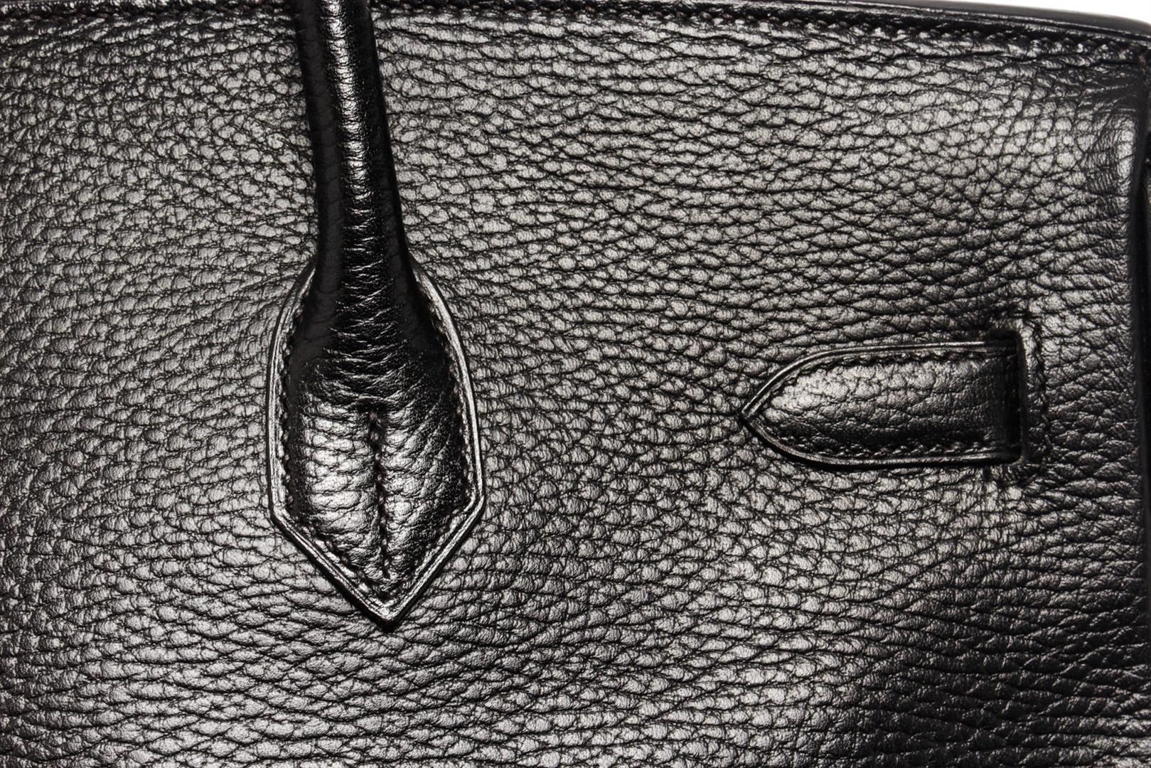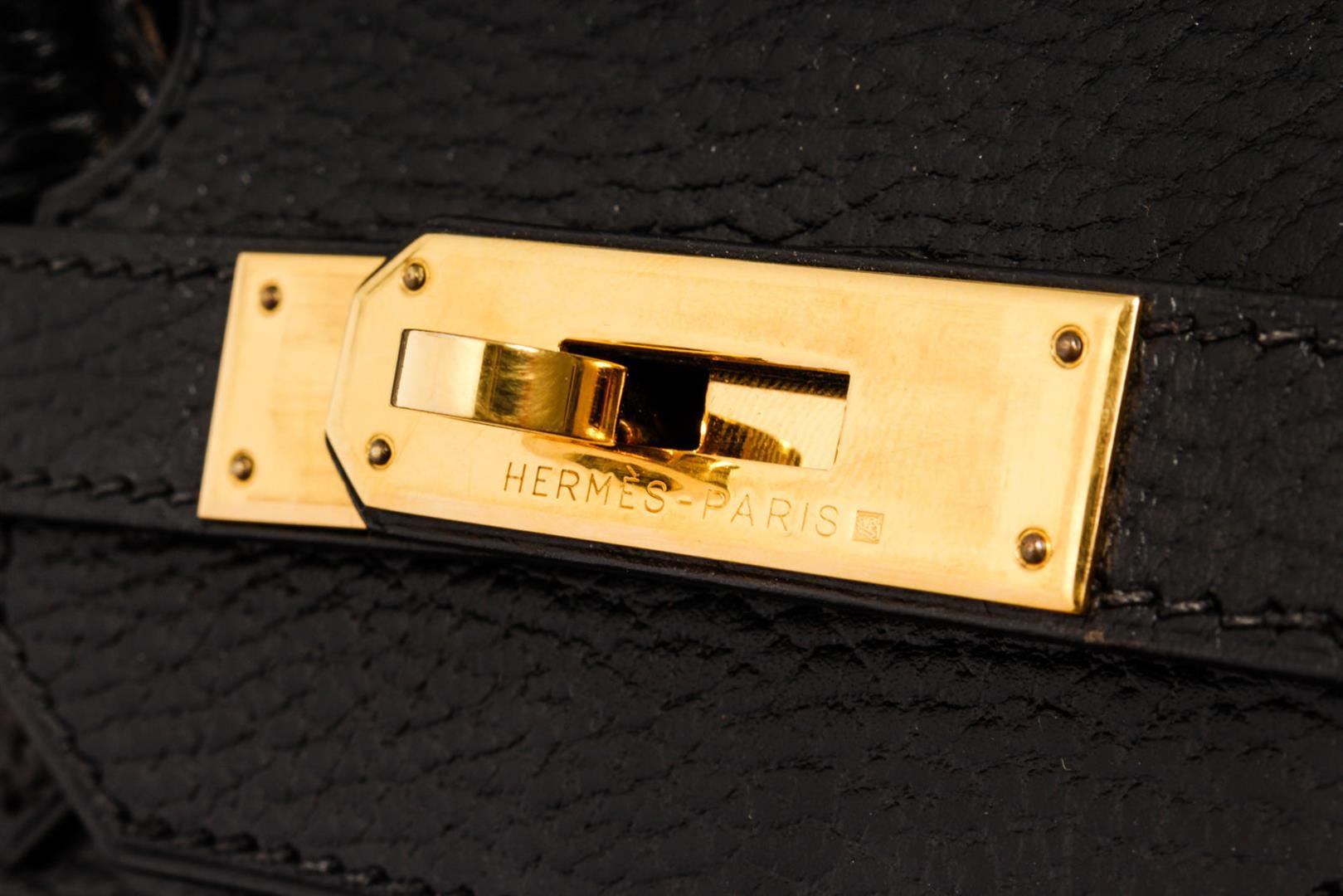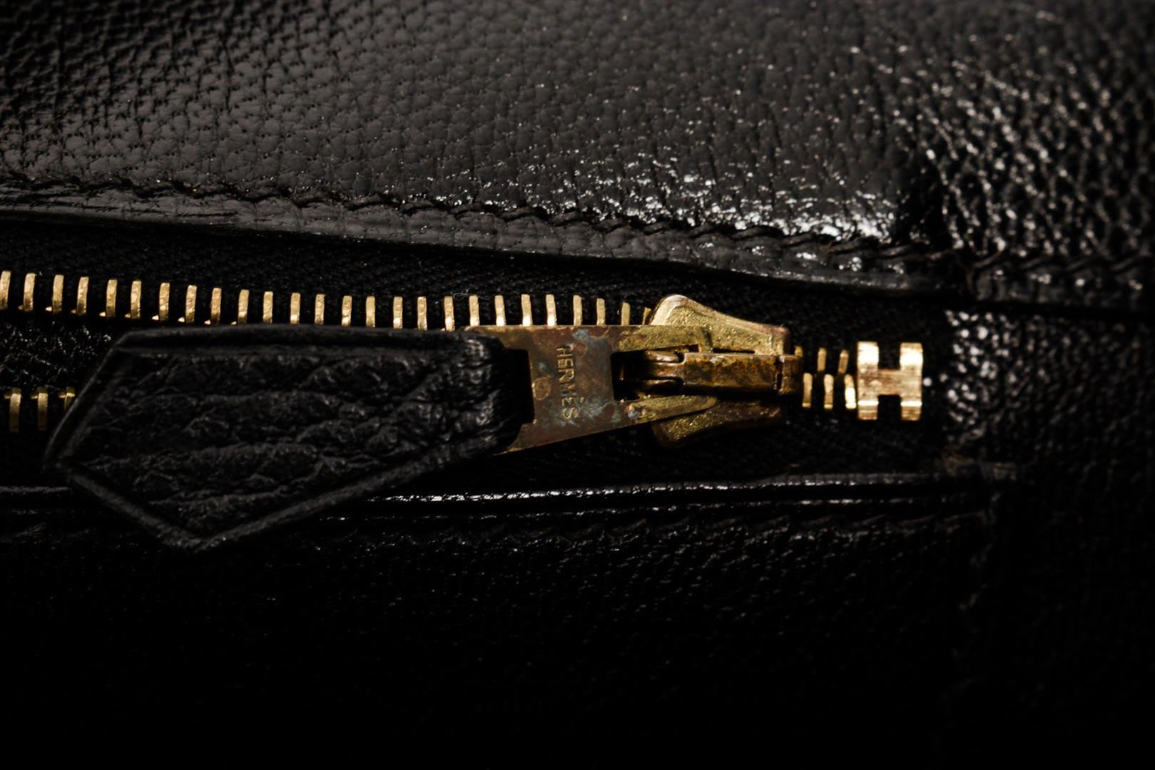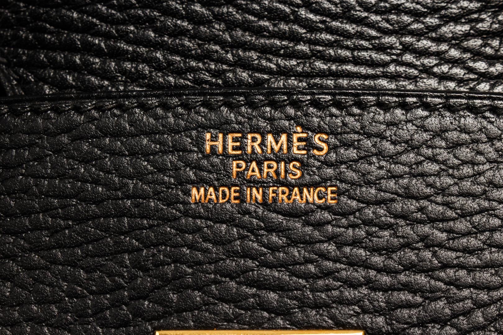 This classic Hermes Birkin 35 cm handbag is done in black Ardennes leather. It features gold-tone hardware, dual rolled top handles and a black Chevre leather-lined interior. The interior has one large compartment, one slide pocket, and one zip pocket. 14" Width x 10" Height x 7" Depth