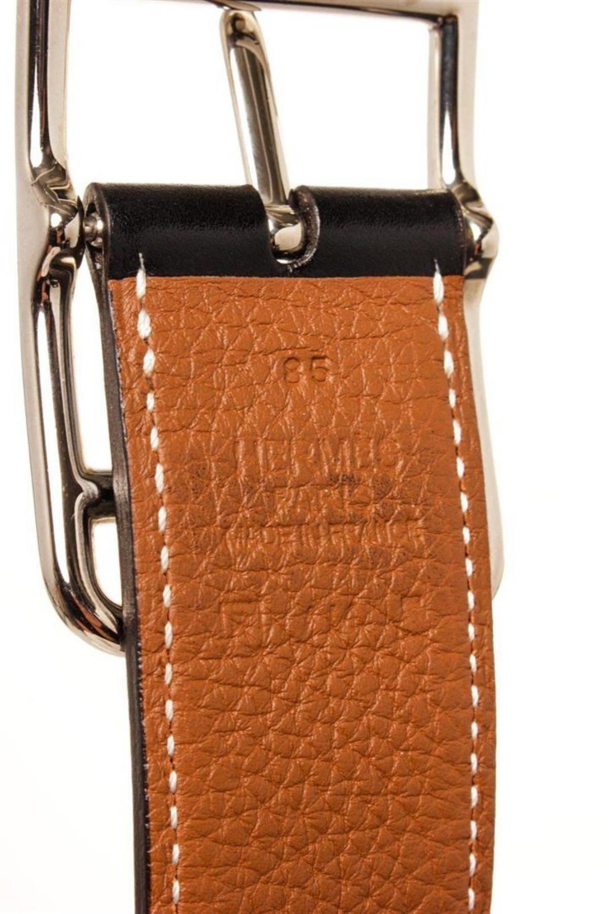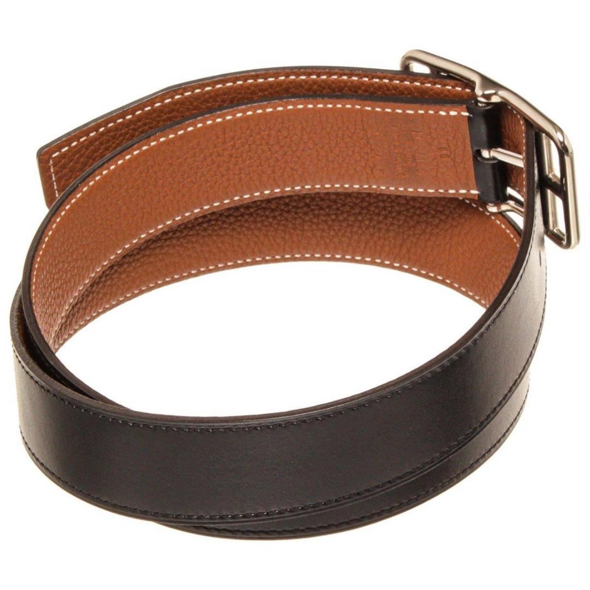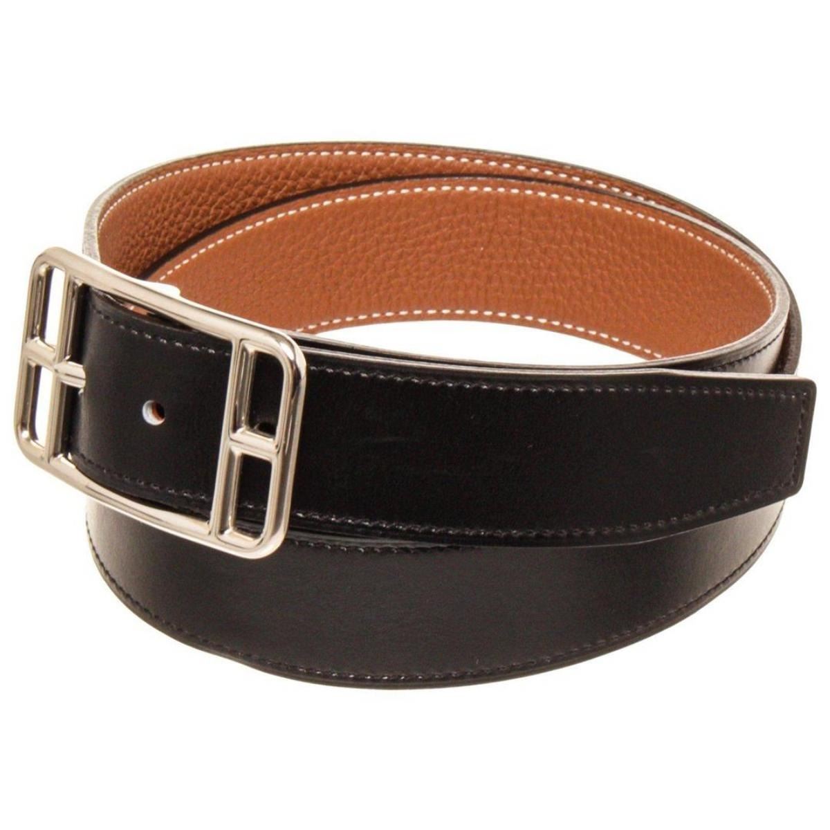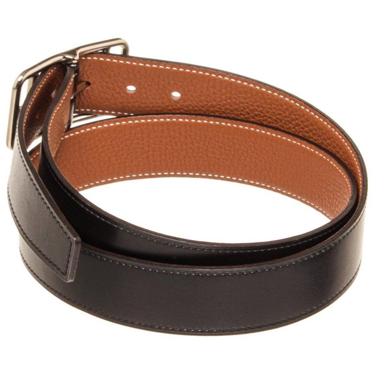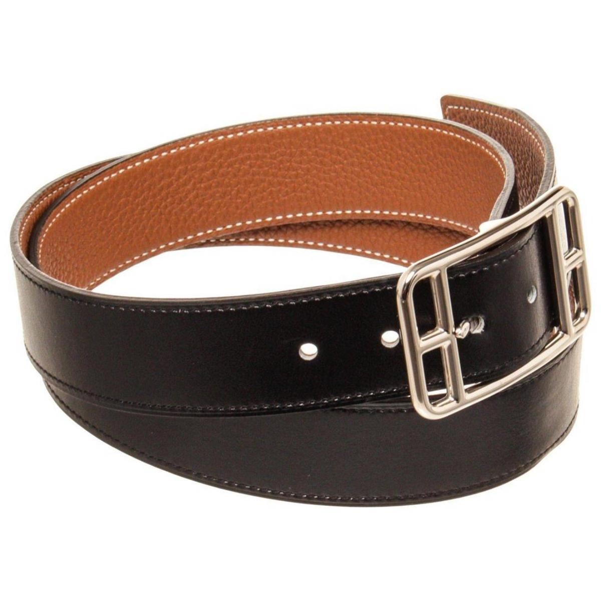 Hermes Black Brown Leather Cape Cod Reva Belt with tonal stitching and gold-plated 'H' buckle featuring peg-in-hole closure. Extra punch hole in belt