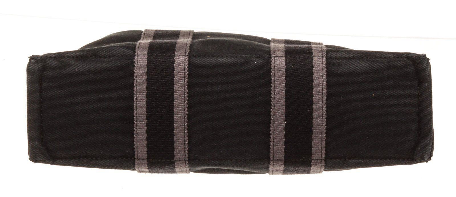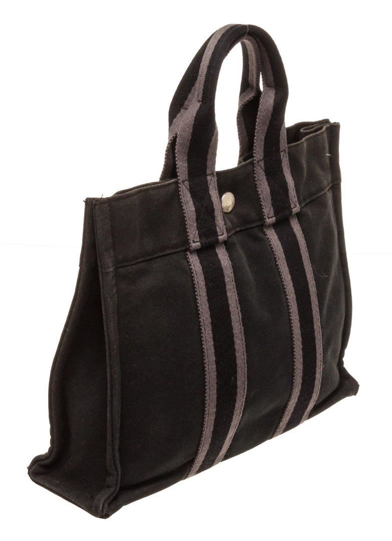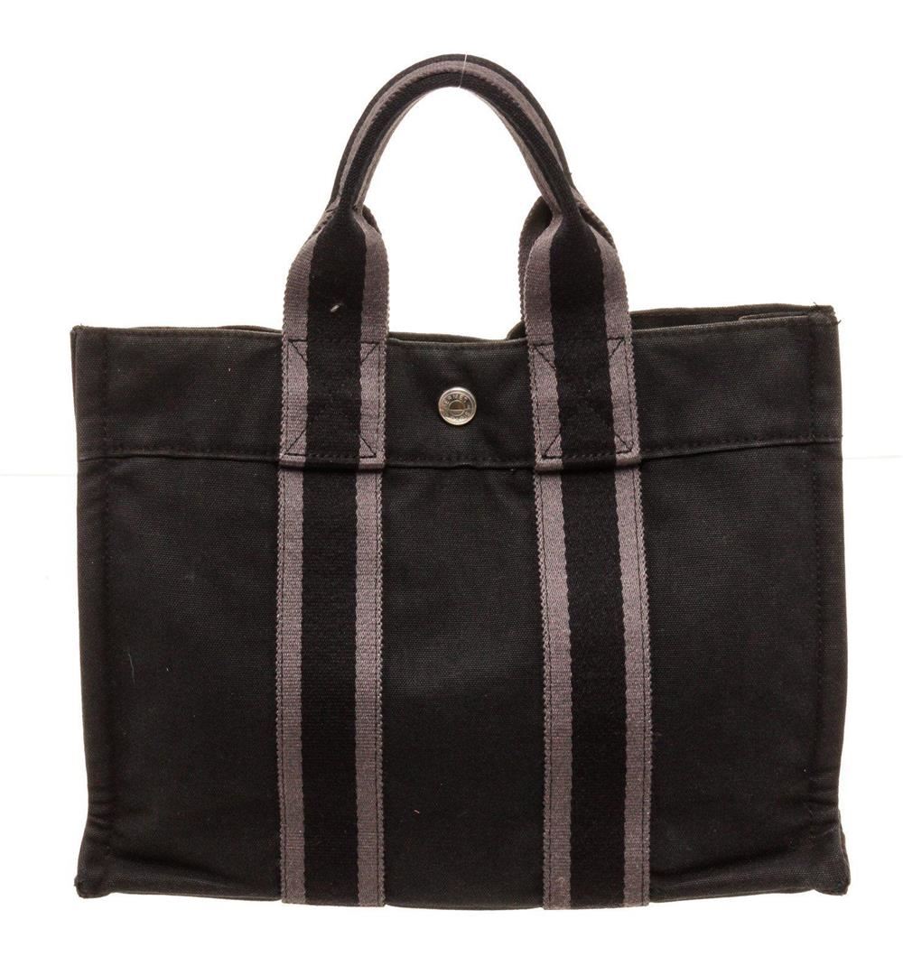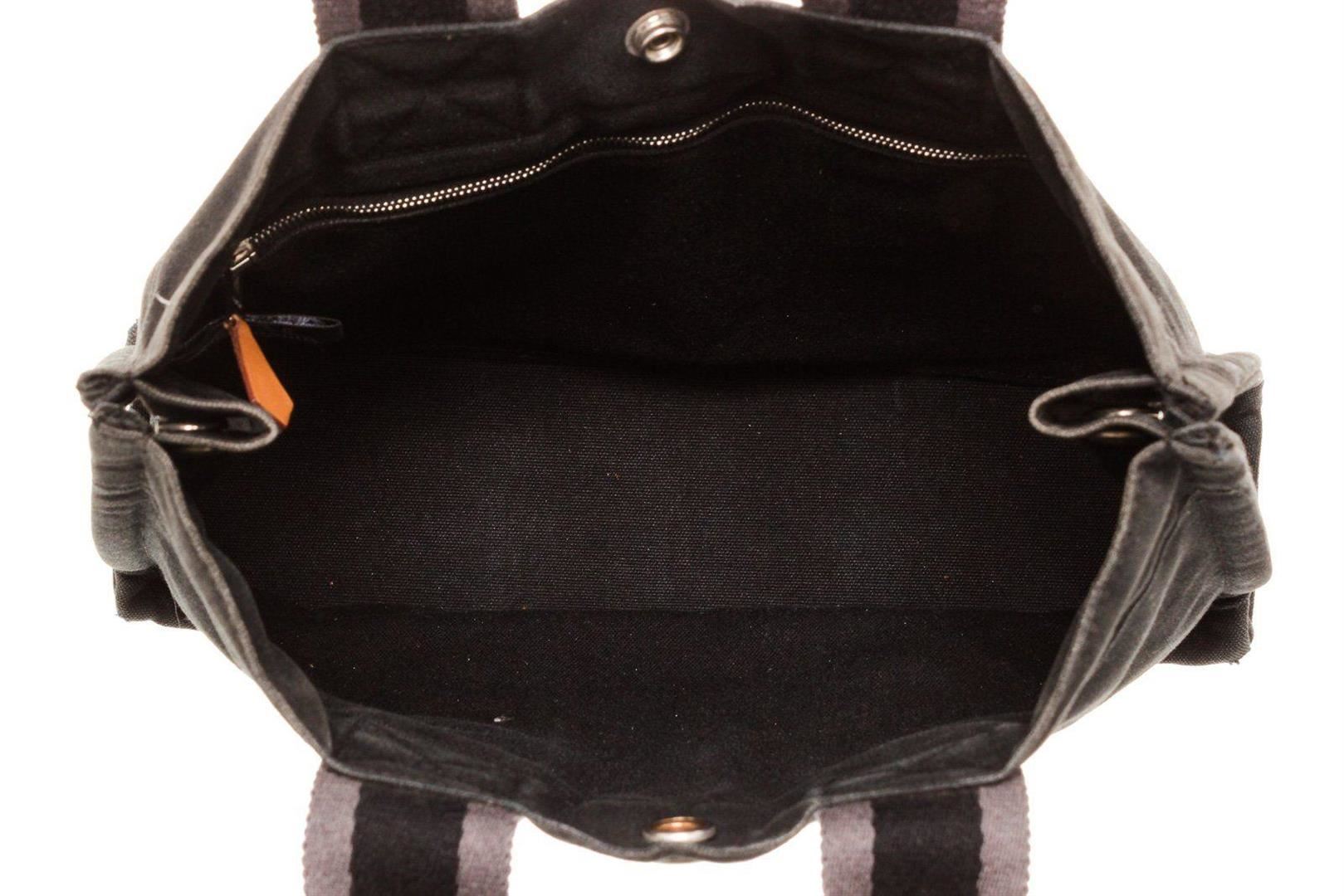 Hermes Black Canvas Leather Herline PM Tote Bag with canvas leather, gold-tone hardware, interior zip pockets, dual top handle and flap closure.