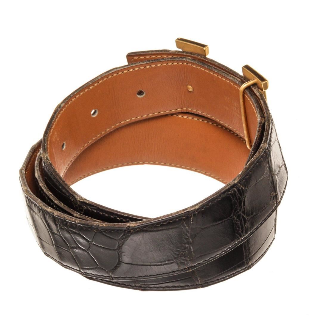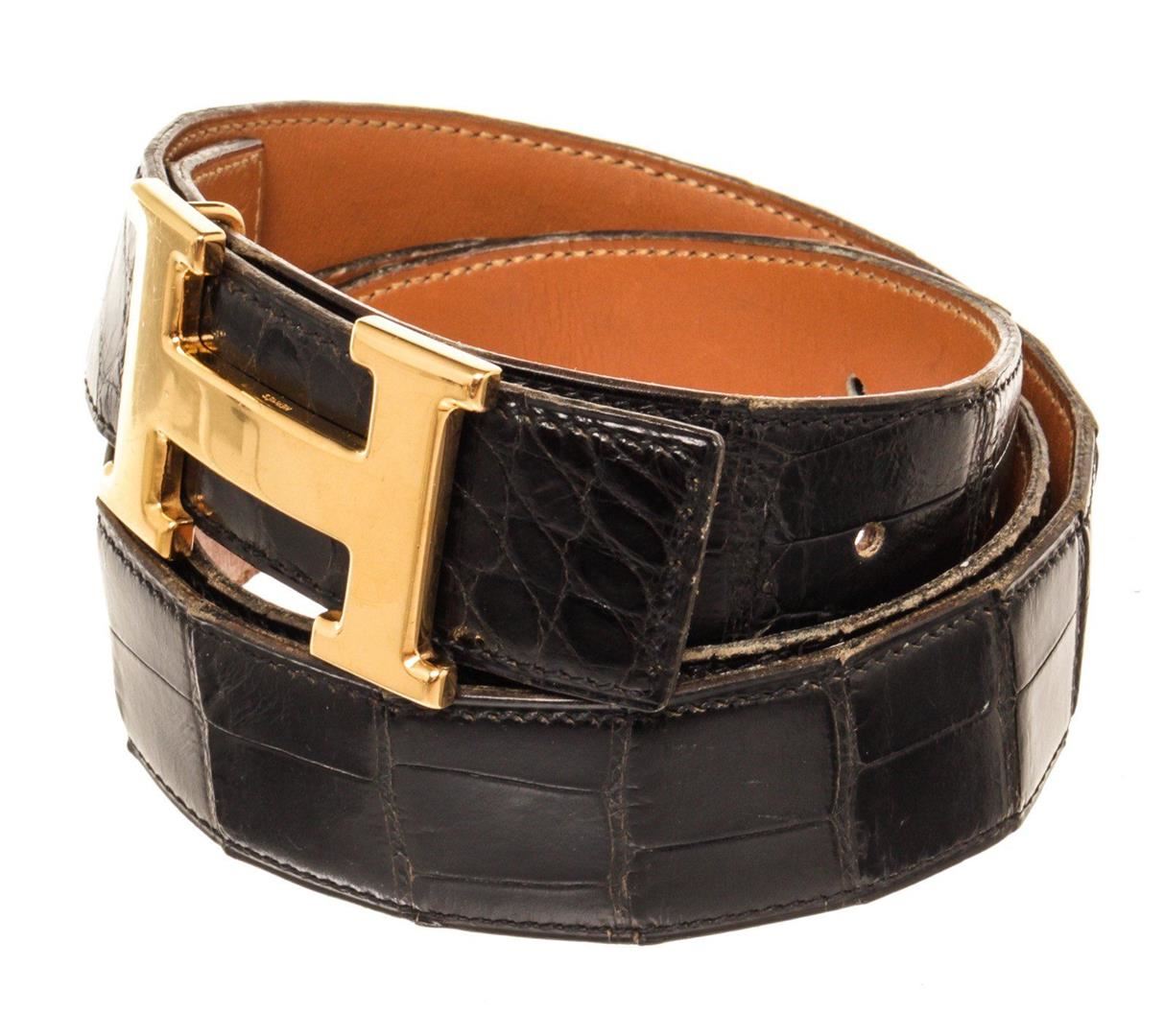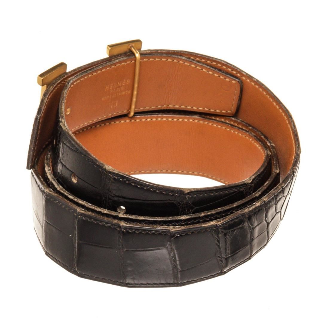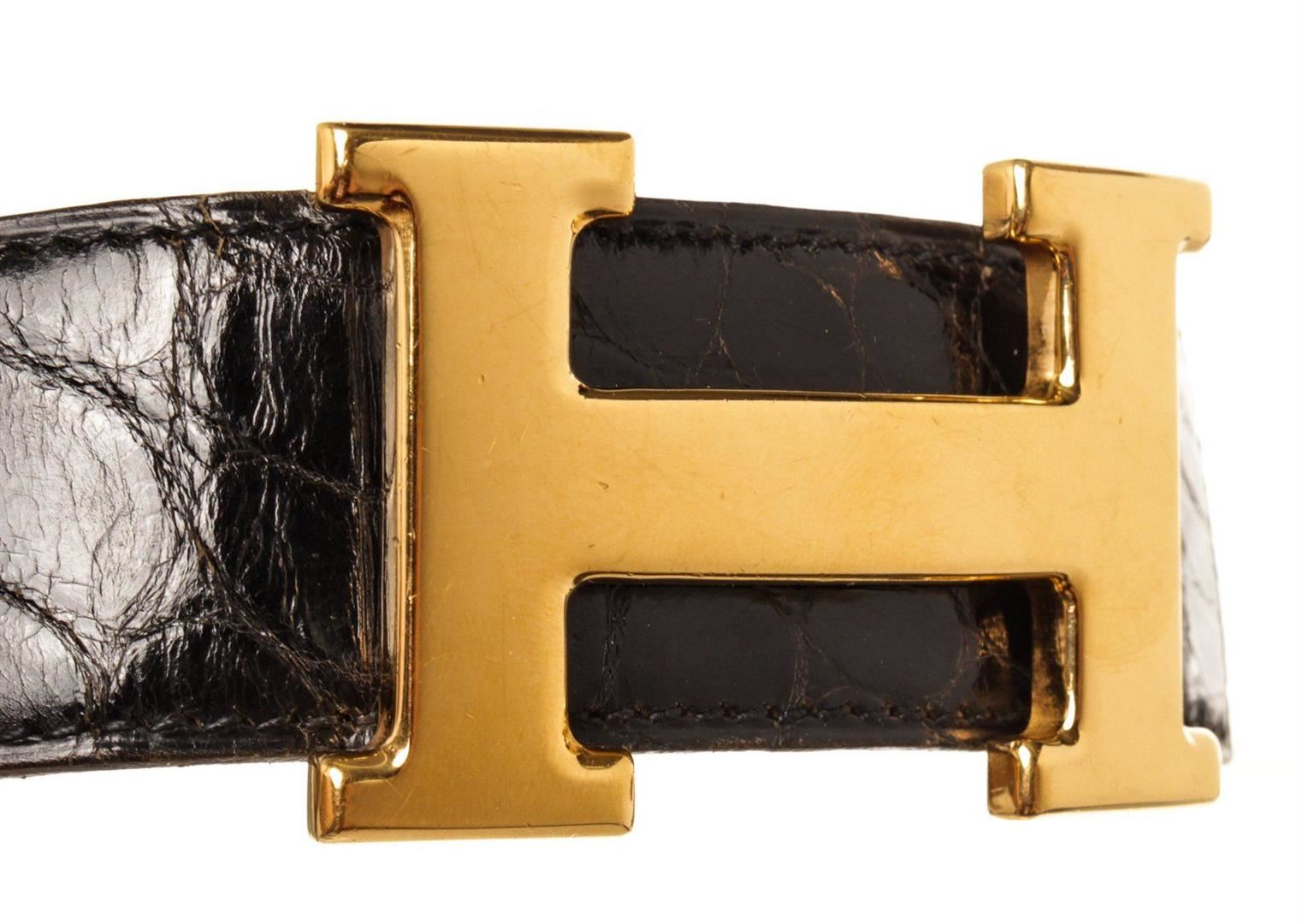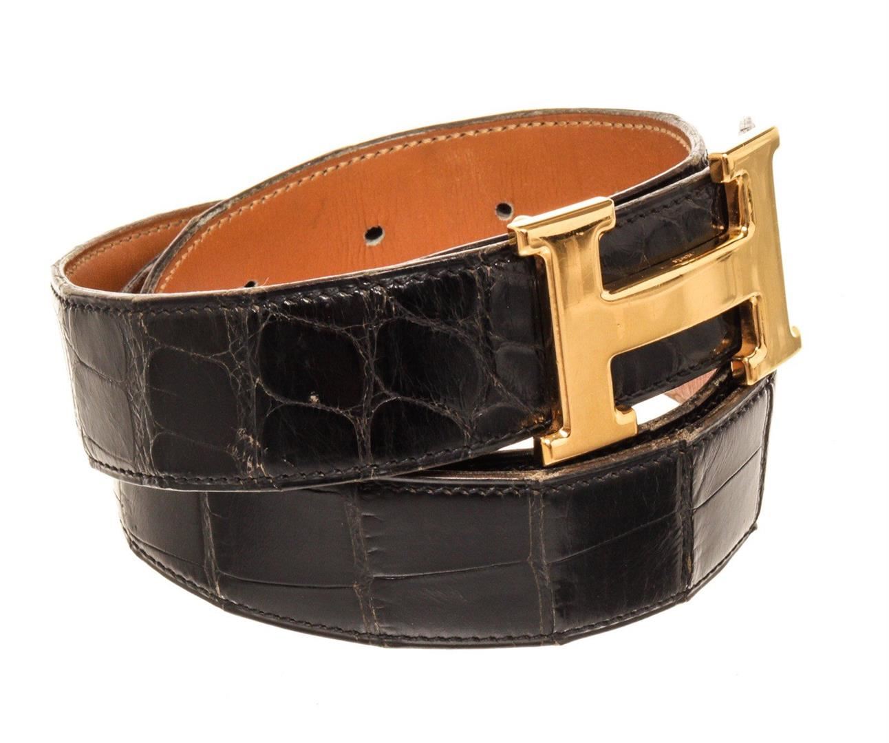 Hermes Black Leather Constance Belt with leather, gold-tone hardware and push lock closure.