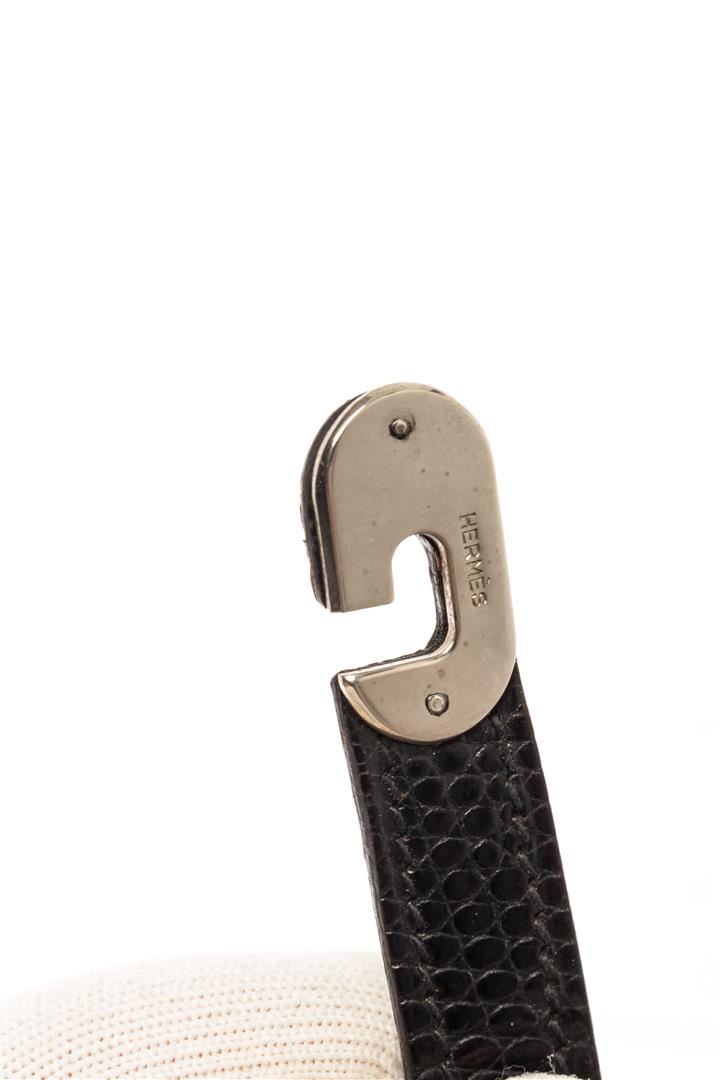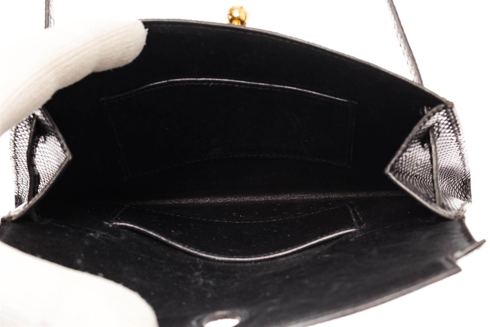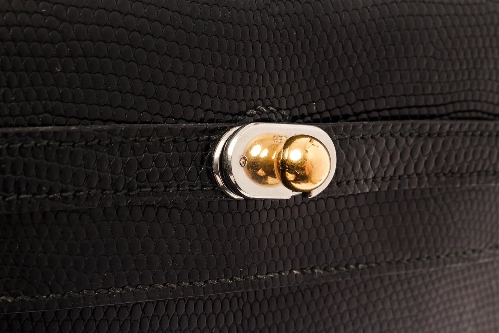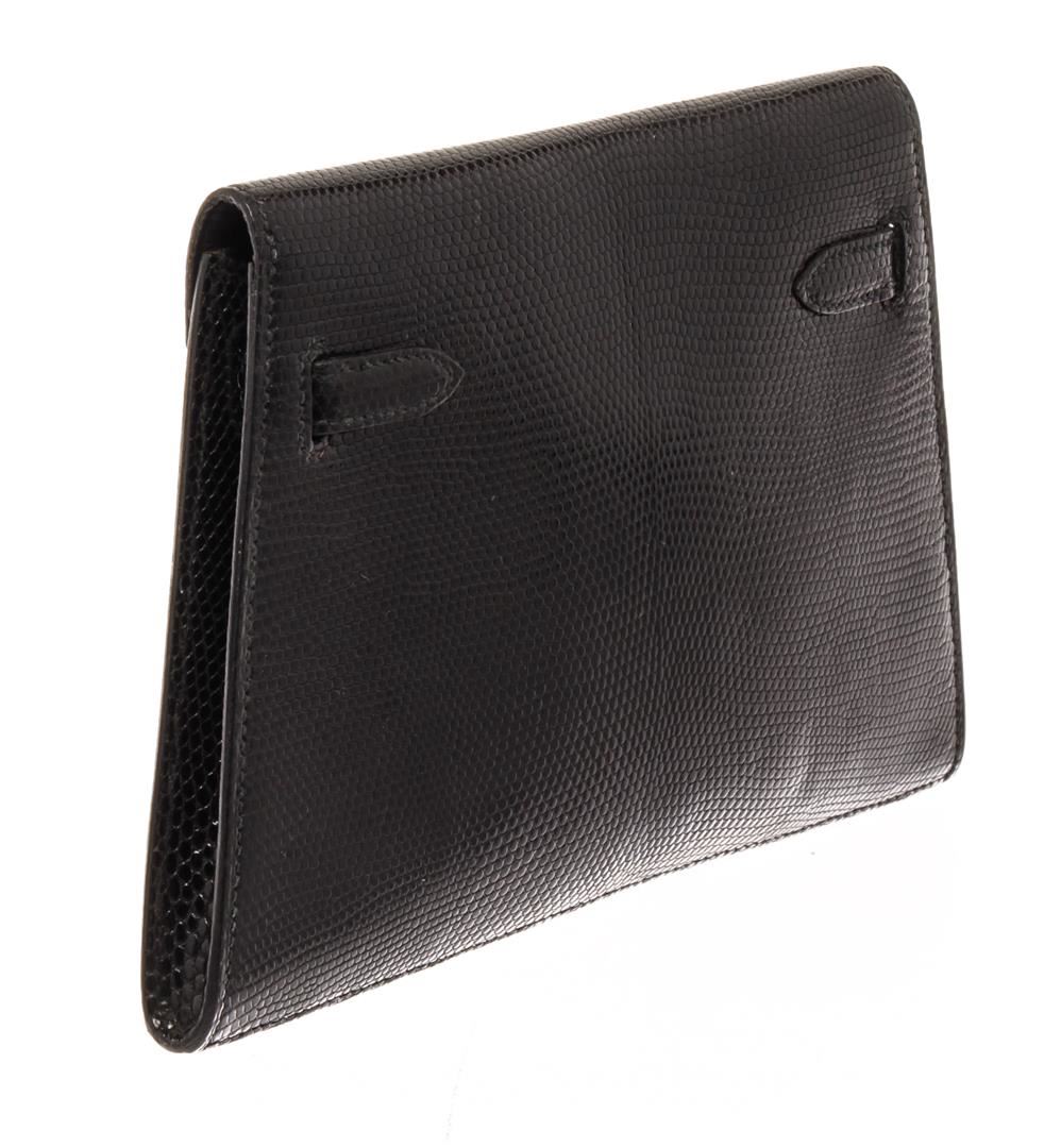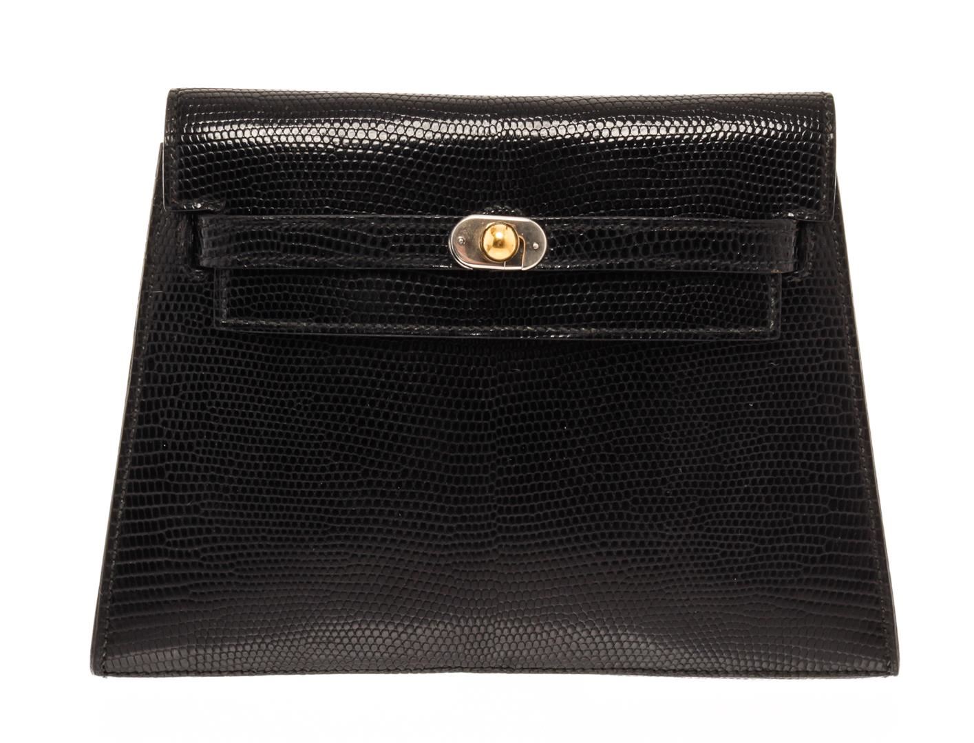 Hermes Black Leather Lizard Kelly Danse Pochette Shoulder Bag. All available information is listed in the description and shown in the photos. Hermes Black Leather Lizard Kelly Danse Pochette Shoulder Bag with black leather, gold-plated hardware, single adjustable shoulder strap, leather lining, turn-lock closure at front. Height 6.5", Width 8.5", Depth 1" / 16.51 x 21.59 x 2.54 cm
