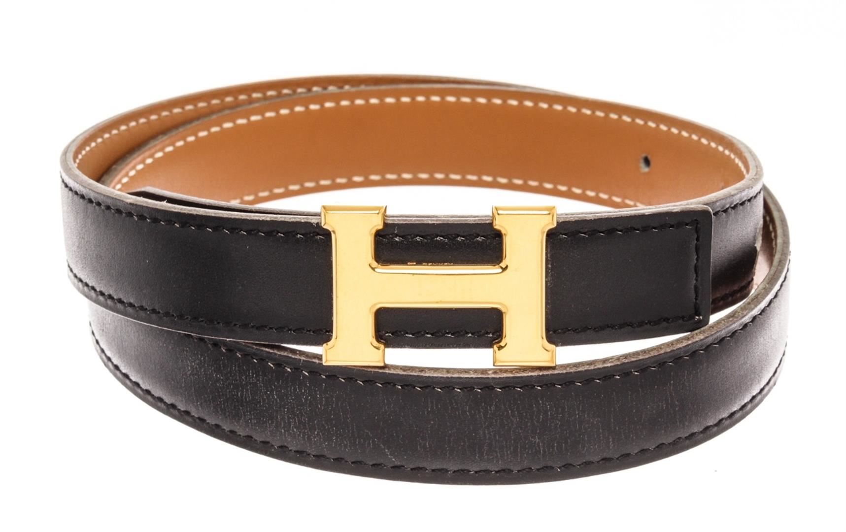 Hermes Black and Brown Leather Mini Constact Belt. All available information is listed in the description and shown in the photos. hermes black and brown leather mini constact belt with black/brown, leather reversible waist belt, featuring gold-plated, metal "h" logo medallion buckle and peg-in-hole closures. Length: 1.5 in (3.81 cm)