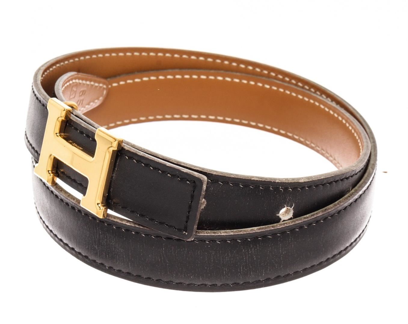 Hermes Black and Brown Leather Mini Constact Belt. All available information is listed in the description and shown in the photos. hermes black and brown leather mini constact belt with black/brown, leather reversible waist belt, featuring gold-plated, metal "h" logo medallion buckle and peg-in-hole closures. Length: 1.5 in (3.81 cm)