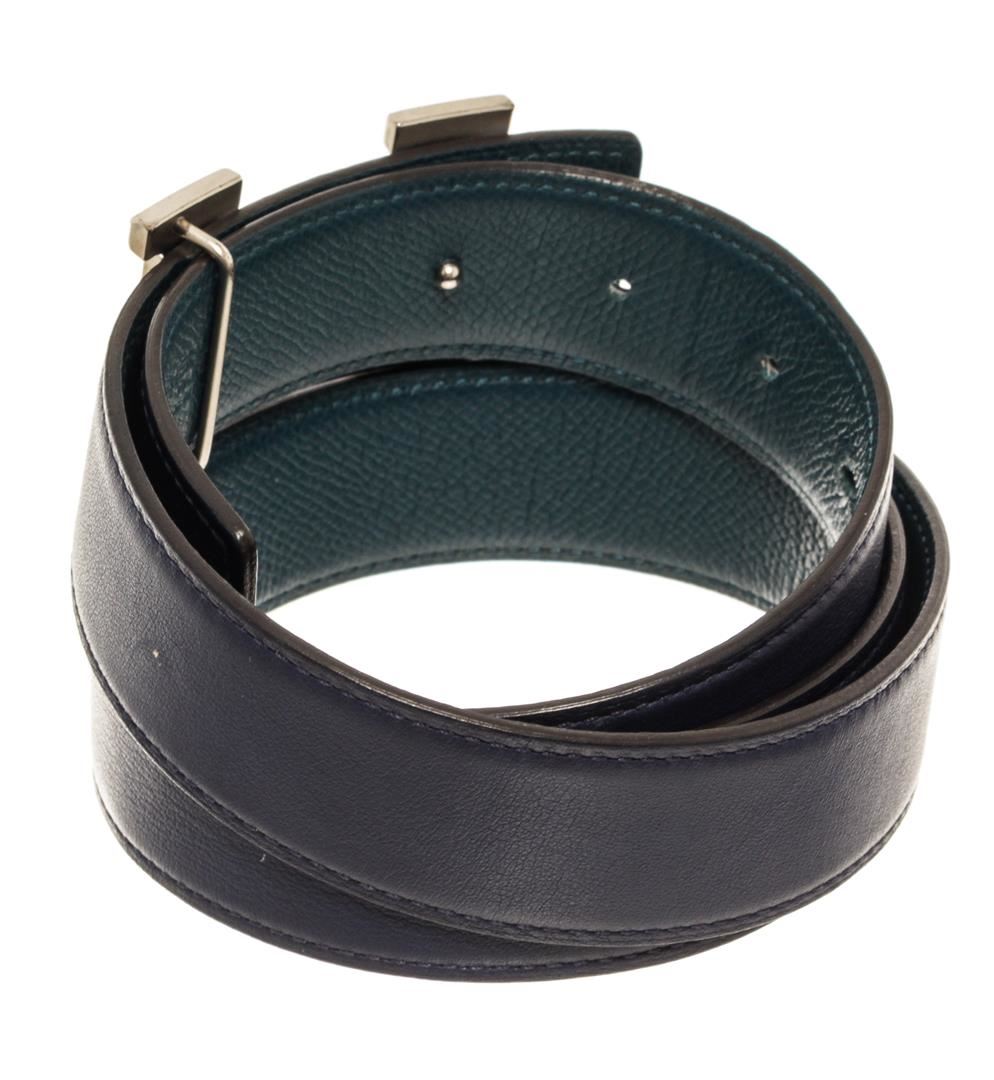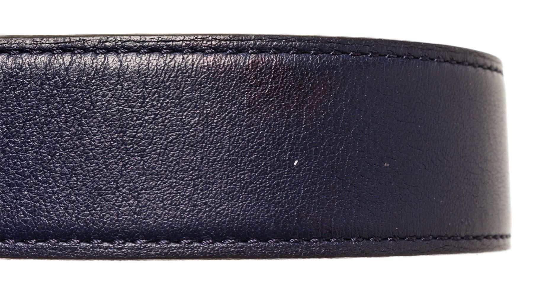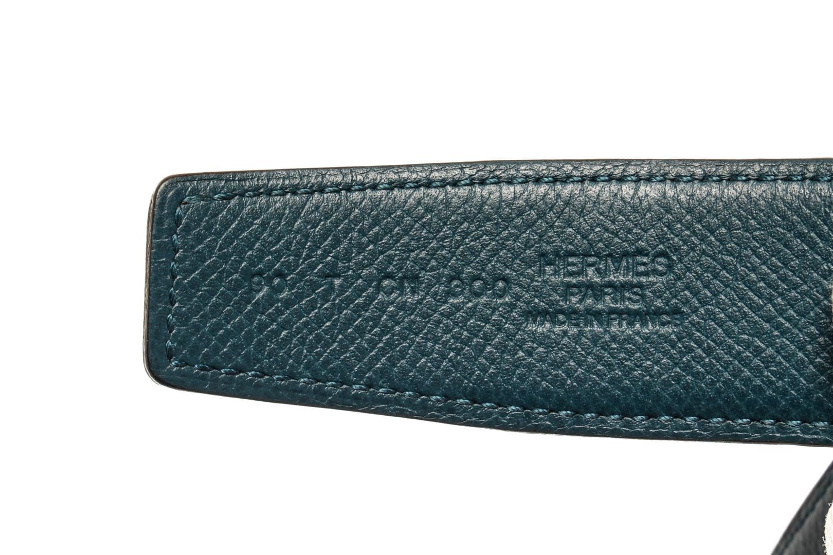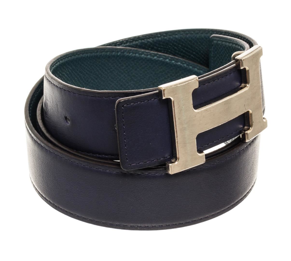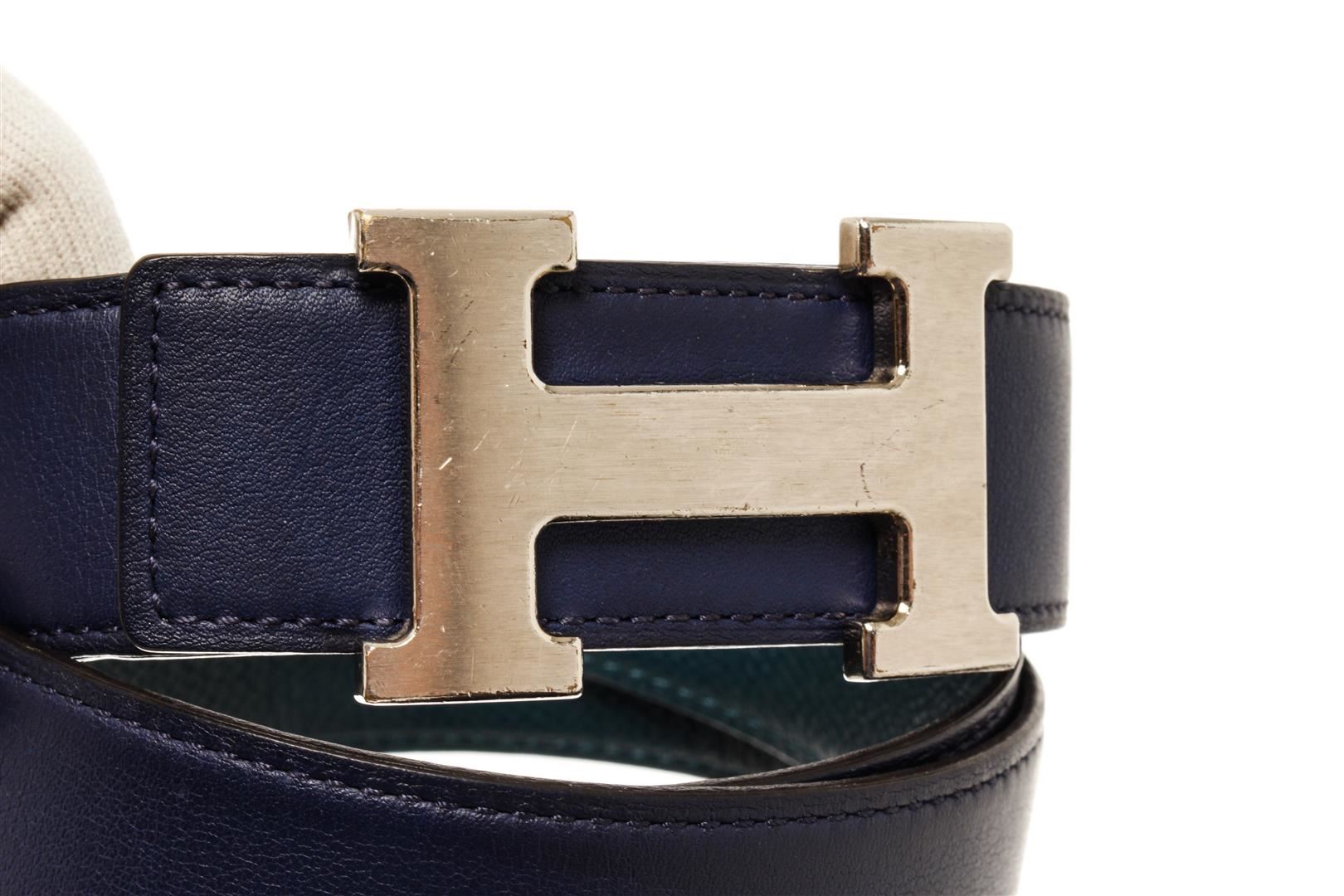 Hermes Blue Leather H Belt. All available information is listed in the description and shown in the photos. Hermes Blue Leather H Belt features tonal stitching sliver-plated Hermes 'H' buckle, blue lining with peg-in-hole closure. Extra punch hole in belt. Please note minor wear to hardware.