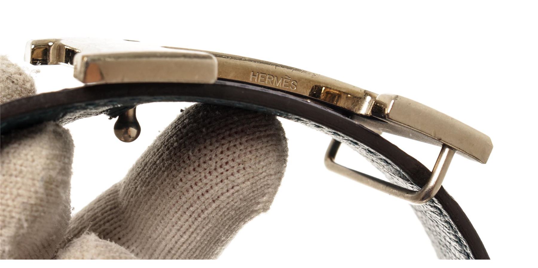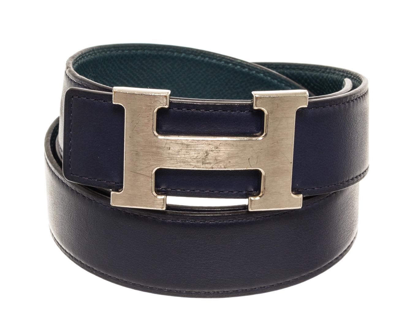 Hermes Blue Leather H Belt. All available information is listed in the description and shown in the photos. Hermes Blue Leather H Belt features tonal stitching sliver-plated Hermes 'H' buckle, blue lining with peg-in-hole closure. Extra punch hole in belt. Please note minor wear to hardware.