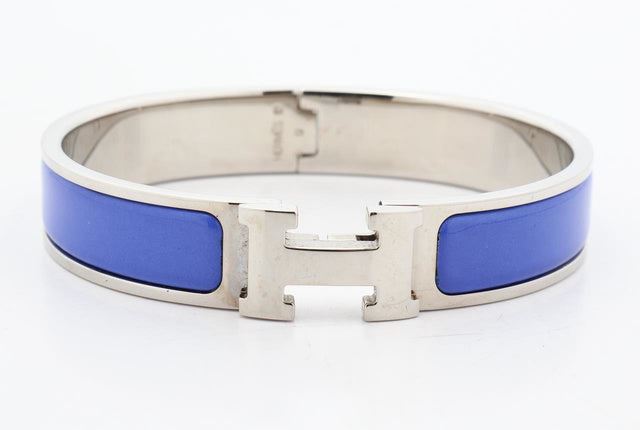 Hermes Clic Clac bangle bracelet in blue metal with palladium-plated hardware and signature H turn-lock closure.