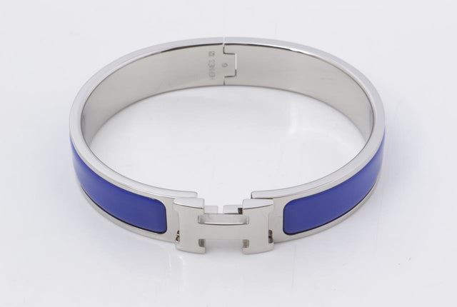 Blue metal Hermes Clic Clac bangle bracelet with Palladium hardware and H turn-lock closure.
