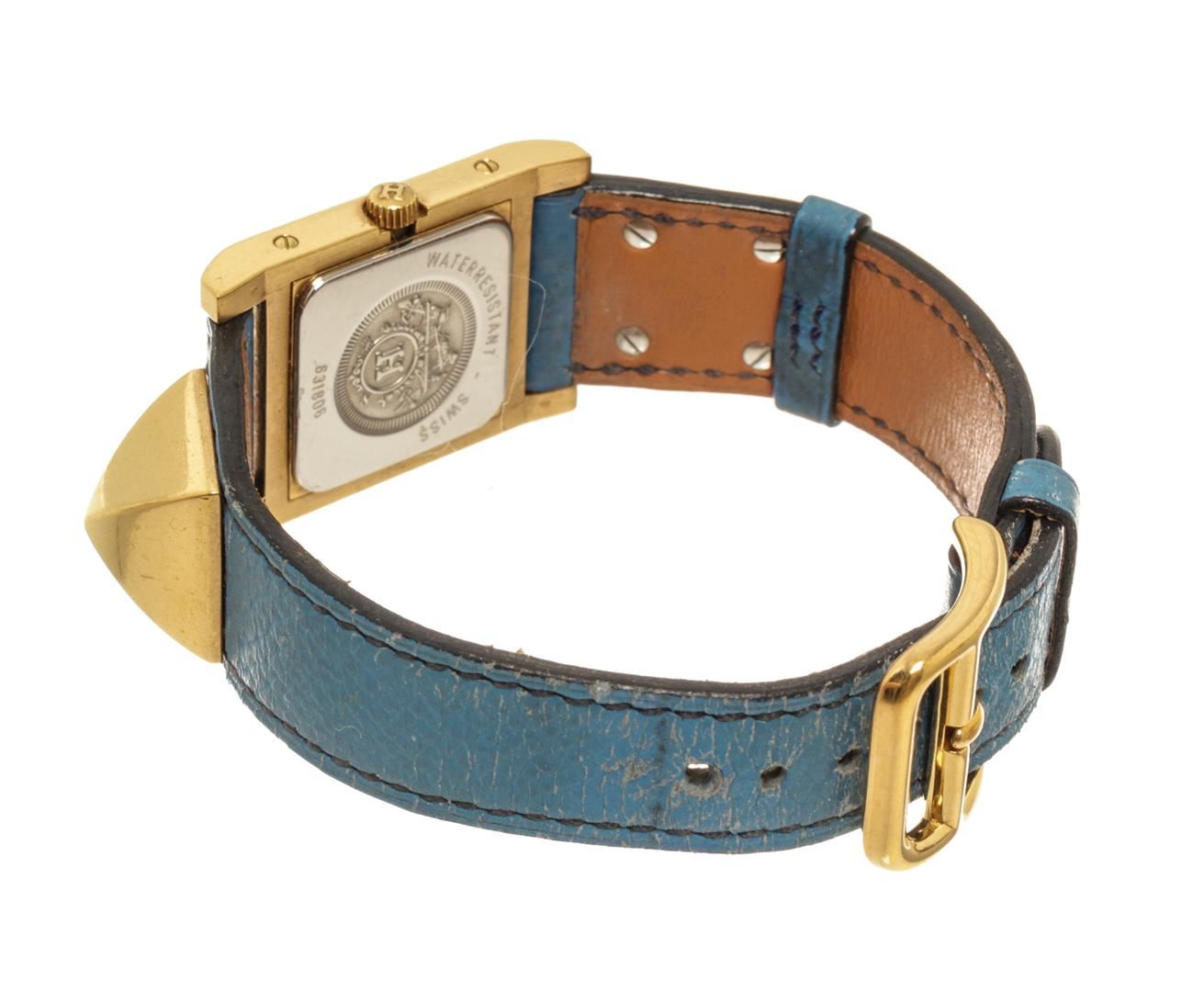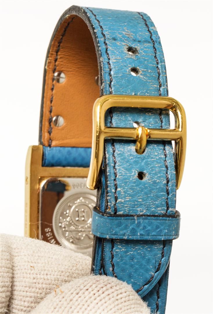 One Hermes Blue Metal and Leather Medor Plated 23 Quartz Watch. Item is sold AS-IS. All available information is listed in the description and shown in the photo. Hermes Blue Metal and Leather Medor Plated 23 Quartz Watch with "dial color white, band color blue, band material leather, case material plated 18k yellow gold, movement quartz" "Case Size/Width: 23mm Watch Height: 16mm Band Width: 18mm Wrist circumference: 6.0""" Height: 0.62" x Width: 0.70" Inches