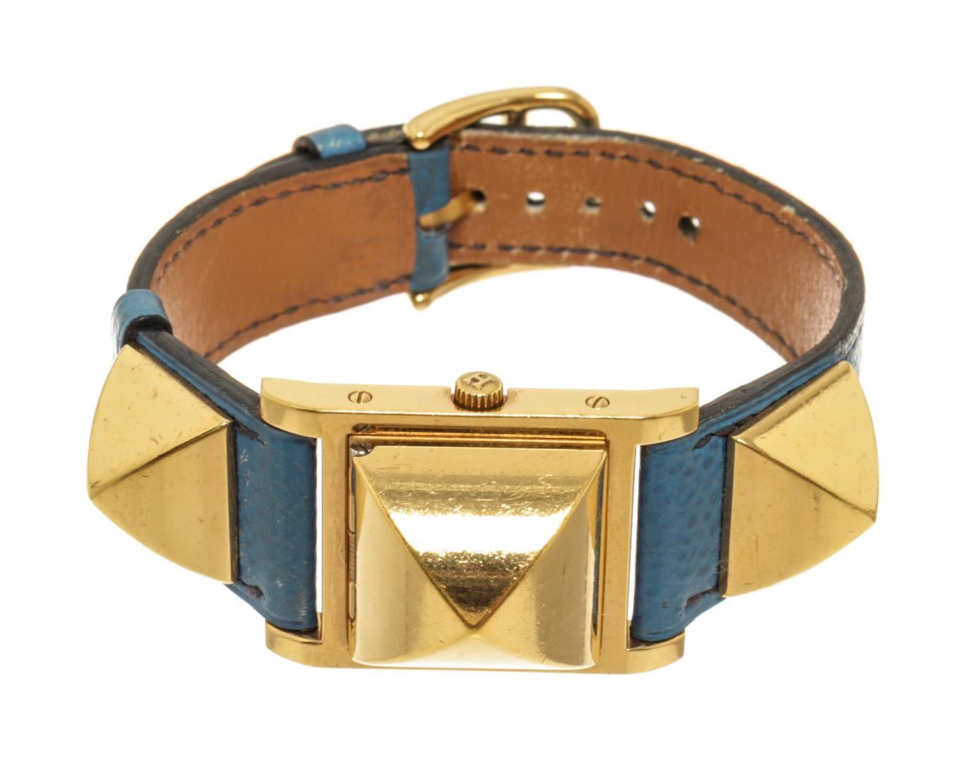 One Hermes Blue Metal and Leather Medor Plated 23 Quartz Watch. Item is sold AS-IS. All available information is listed in the description and shown in the photo. Hermes Blue Metal and Leather Medor Plated 23 Quartz Watch with "dial color white, band color blue, band material leather, case material plated 18k yellow gold, movement quartz" "Case Size/Width: 23mm Watch Height: 16mm Band Width: 18mm Wrist circumference: 6.0""" Height: 0.62" x Width: 0.70" Inches
