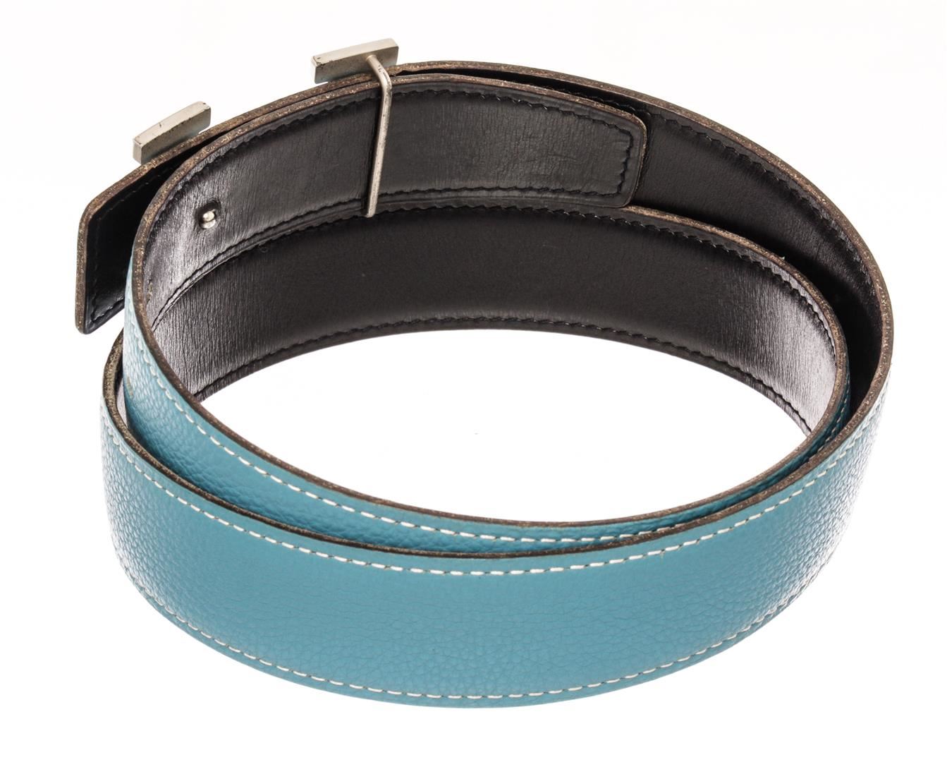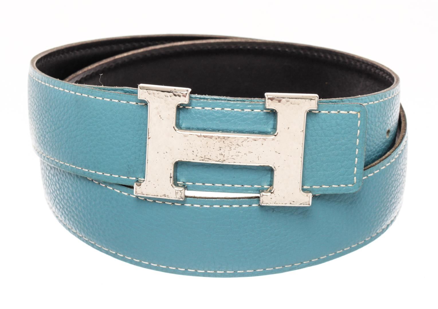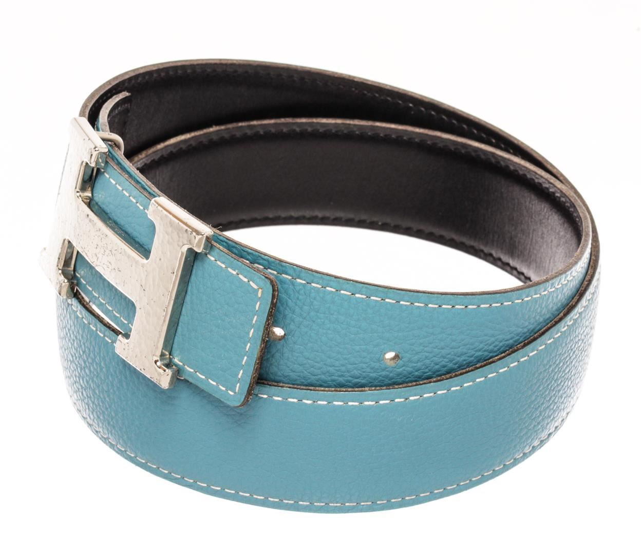 Hermes Blue and Black Leather Silver Tone H buckle Belt. All available information is listed in the description and shown in the photos. Hermes Blue and Black Leather Silver Tone H Buckle Belt with blue leather. 36.6 x 1.3 x 0 inches / 93 x 3.2 x 0 cm