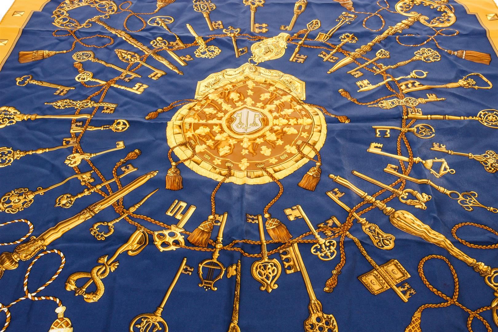 Hermes Blue and Golden Silk Les Clefs Scarf. All available information is listed in the description and shown in the photos. Hermes Blue and Golden Silk Les Clefs Scarf with gold-tone hardware, multicolour hermès 90cm silk scarf with les clèfs motif and hand-rolled edges.