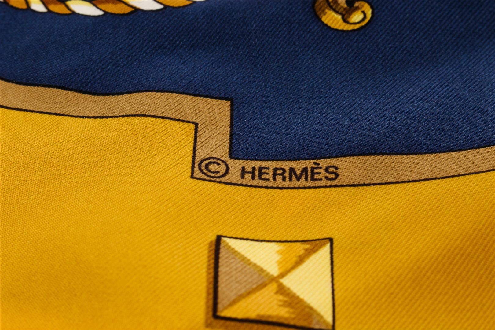 Hermes Blue and Golden Silk Les Clefs Scarf. All available information is listed in the description and shown in the photos. Hermes Blue and Golden Silk Les Clefs Scarf with gold-tone hardware, multicolour hermès 90cm silk scarf with les clèfs motif and hand-rolled edges.