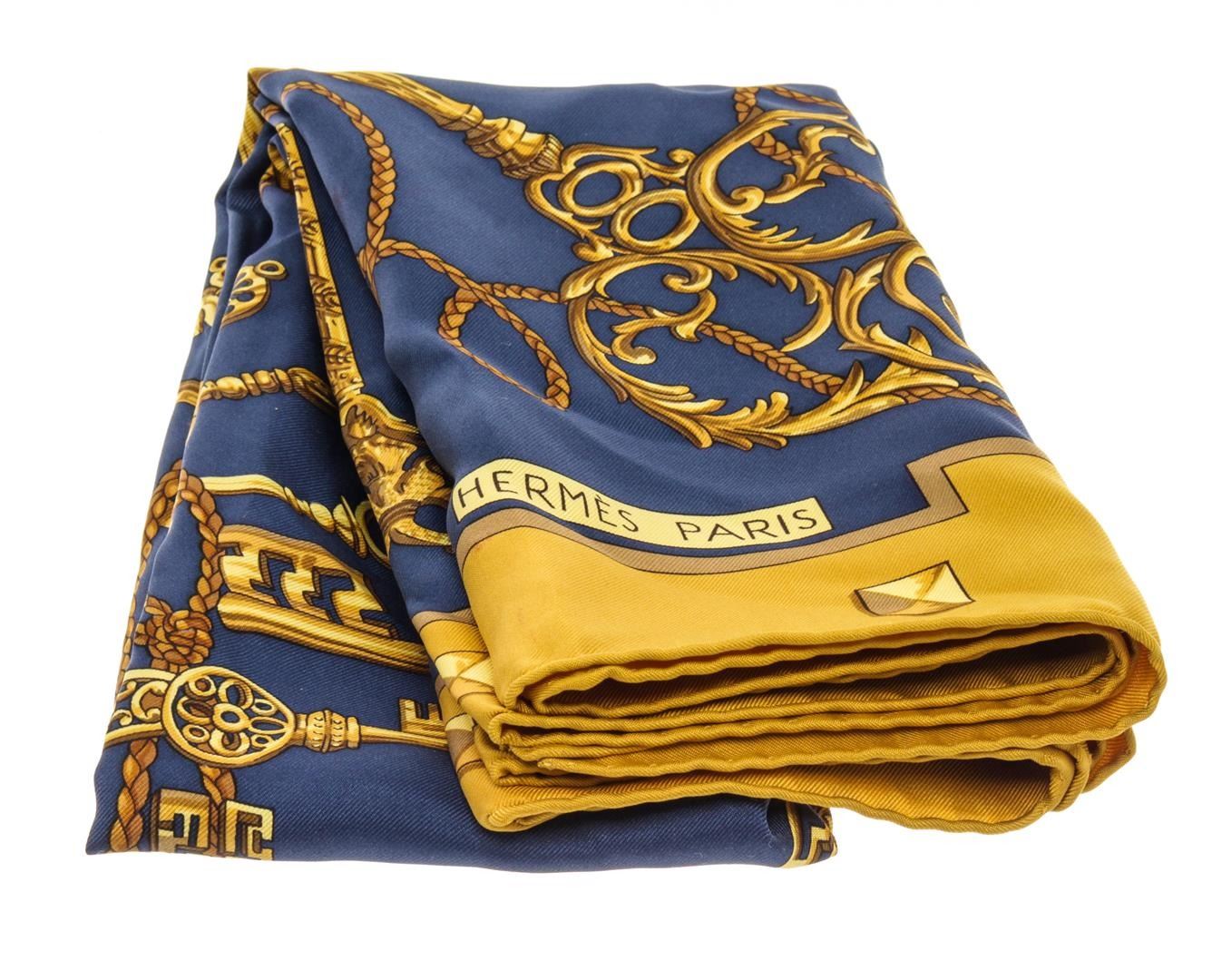 Hermes Blue and Golden Silk Les Clefs Scarf. All available information is listed in the description and shown in the photos. Hermes Blue and Golden Silk Les Clefs Scarf with gold-tone hardware, multicolour hermès 90cm silk scarf with les clèfs motif and hand-rolled edges.