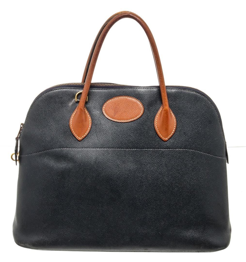 Hermes Bolide Bag handbag blue leather. Brand: Hermes, Style: Bolide Bag, Type: handbag, Exterior Color: blue, Exterior Material: leather, Exterior Pockets: None, Interior Color: brown, Interior Material: fabric, Interior Pockets: one, Closure: zipper, Handle/Strap Type: dual Top Handle, Length: 14 1/2, Width: 5 3/4, Height: 1N/A 1/2, Handle Drop: 4 1/2. Condition: wear on handles. Additional Information: brown handles, brown purse insert. Item is sold AS-IS and all information pertaining to this lot is available in the photos or this description.
