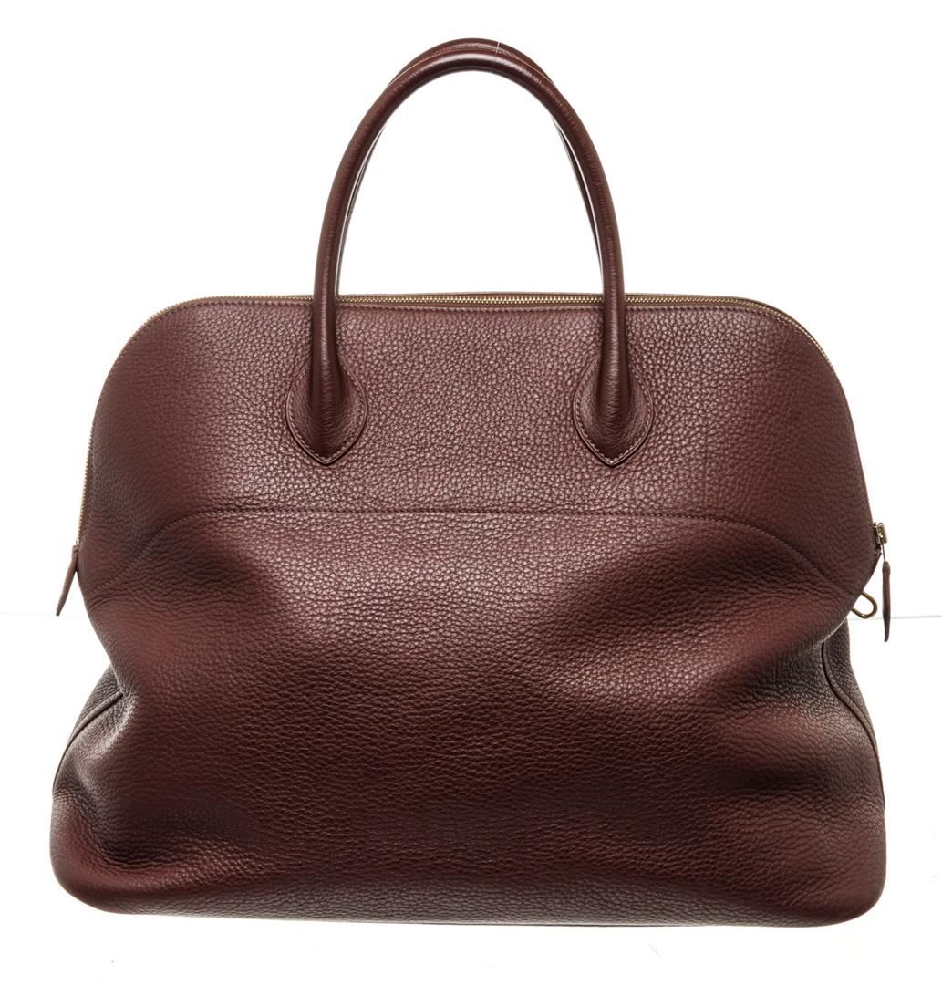 One Hermes Brown Leather Bolide 45cm Shoulder Bag. Item is sold AS-IS. All available information is listed in the description and shown in the photo. Hermes Brown Leather Bolide 45cm Shoulder Bag with leather, gold-tone hardware, trim leather, dual top handle and zipper closure.