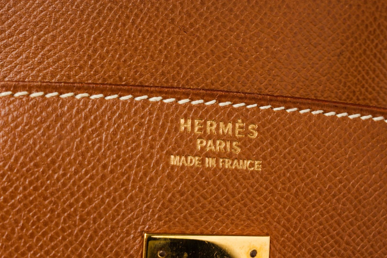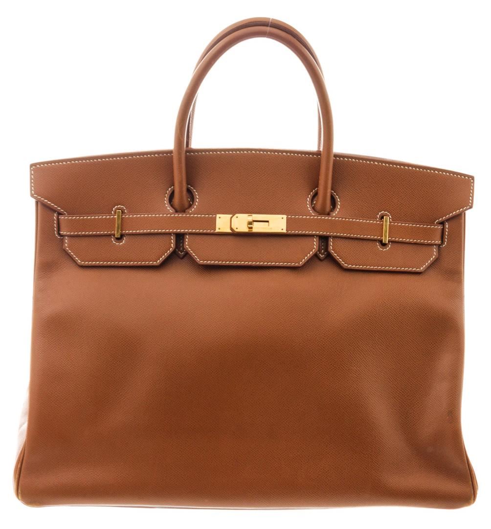 Hermes Brown Leather Brikin 40cm Satchel Bag with leather, gold-tone hardware, trim leather, interior slip pocket, dual top handle and turn lock closure.