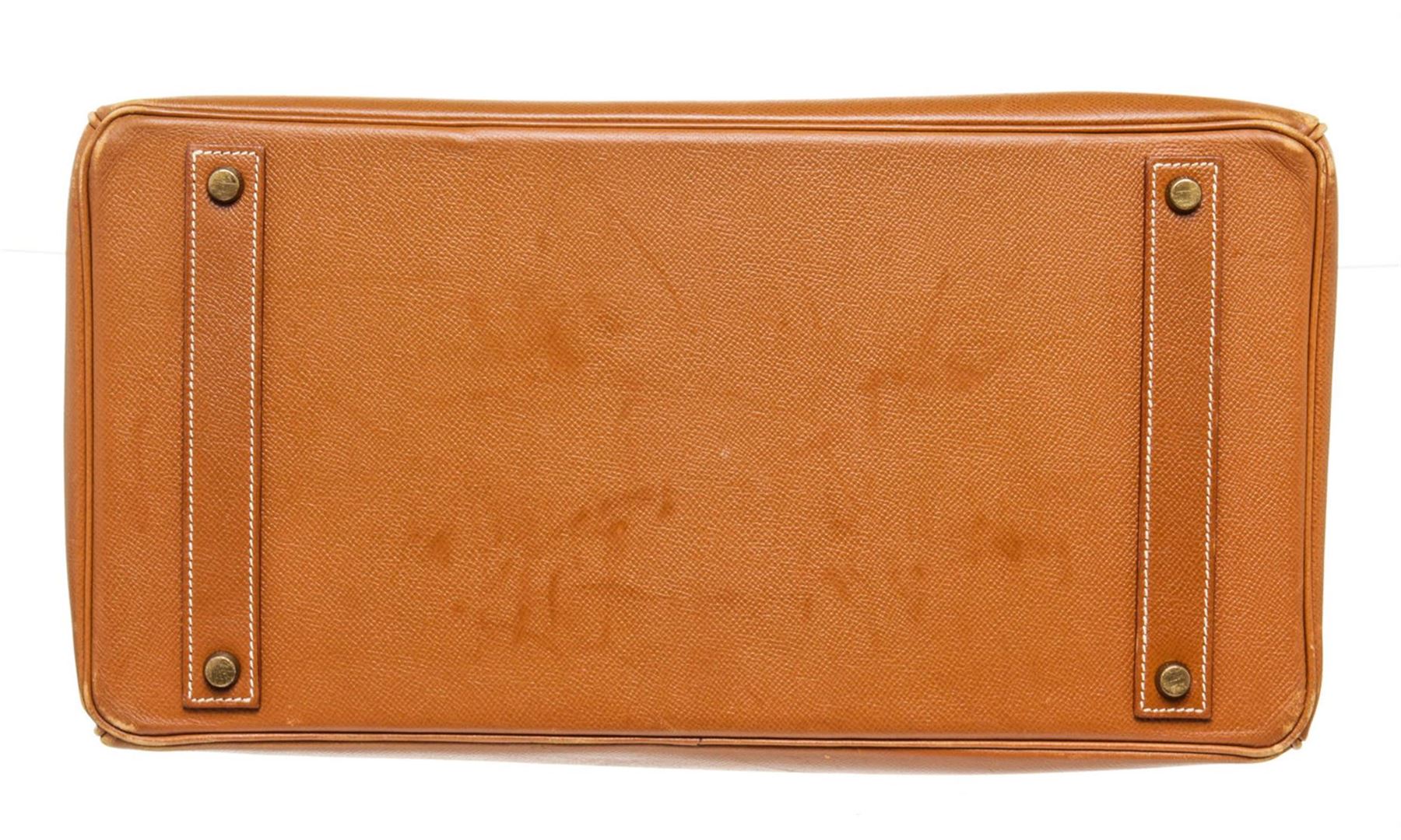 Hermes Brown Leather Brikin 40cm Satchel Bag with leather, gold-tone hardware, trim leather, interior slip pocket, dual top handle and turn lock closure.