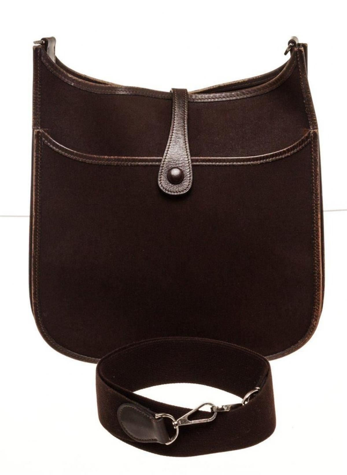 Hermes Brown Leather Evelyne 1 GM Crossbody Bag. Hermes Brown Leather Evelyne 1 GM Crossbody Bag with material leather, gold-tone hardware, suede lining, shoulder strap and snap closure.