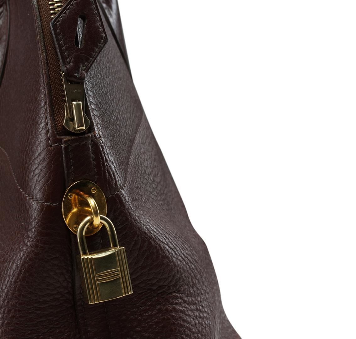 One Hermes Brown Leather Purse featuring: Double strap handle, shoulder sling, and gold tone metal zipper at the top. Includes lock but no key. Measures approximately 14 x 11 x 6 1/2".