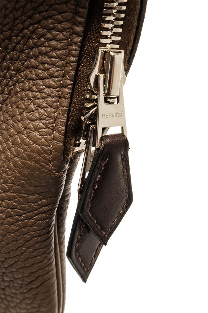 One Hermes Brown Togo Leather Victoria Travel Briefcase. Item is sold AS-IS. All available information is listed in the description and shown in the photo. Hermes Brown Togo Leather Victoria Travel Briefcase with brown Togo leather, silver-tone hardware, trim leather, interior slip pocket, dual top handle, and zipper closure. Height 13", Width 19", Depth 2"