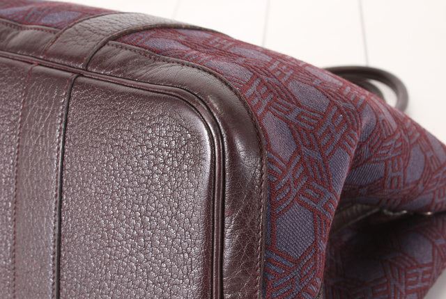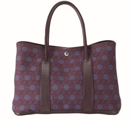 Burgundy printed Toile and leather Hermes Garden Party 36 cm tote bag with Palladium hardware, dual rolled leather shoulder straps, woven canvas lining single interior pocket and snap closure at top. 6 HHeight 10.5" Width: 14.epth: 7" Handle