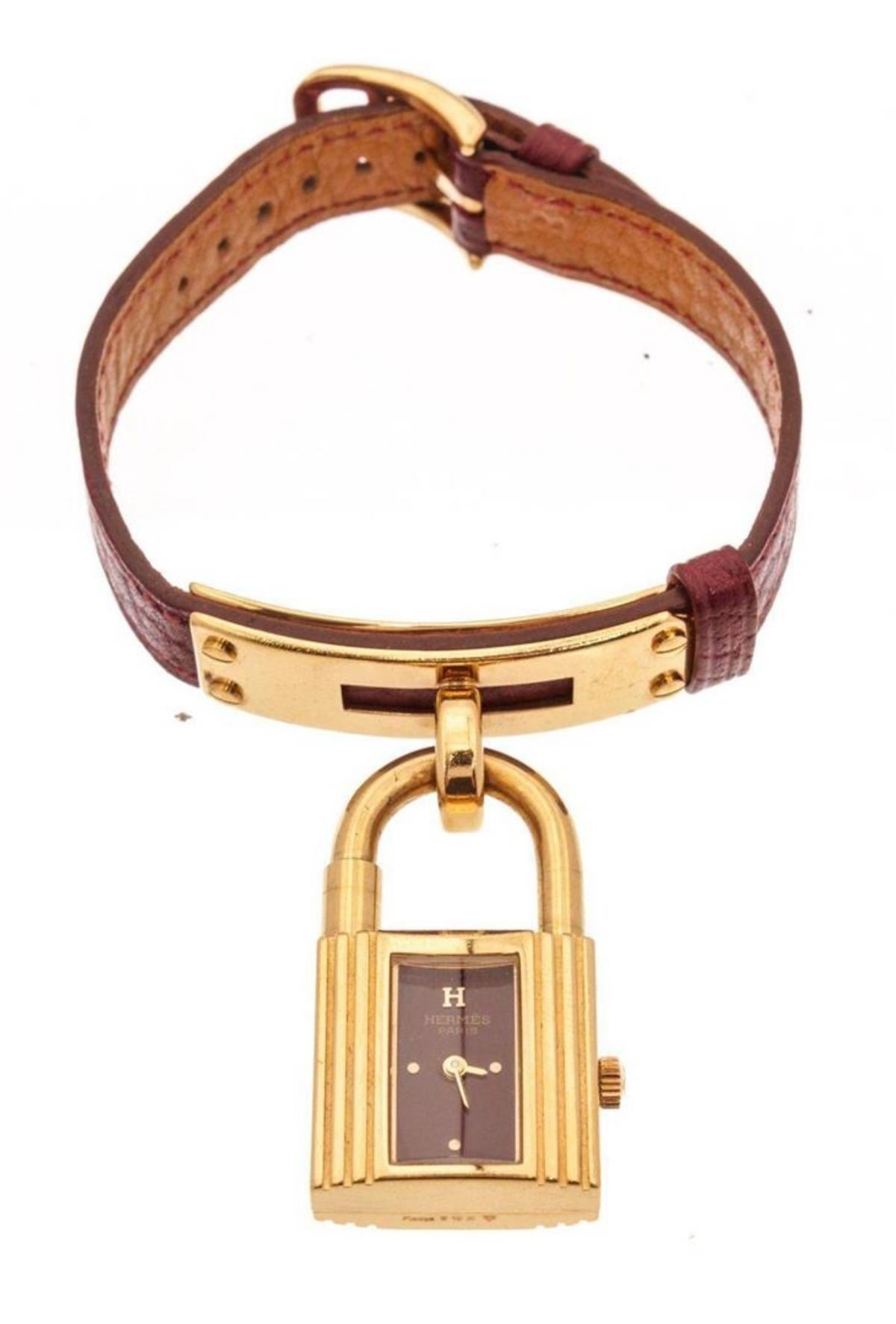 Hermes Burgundy kelly Watch. Hermes Burgundy kelly Watch with gold-tone hardware turn lock closure. MEASUREMENTS: Length 14 in / 36 cm Width 18.5 in / 47 cm Height 6 in / 15 cmCONDITION: Pre-Owned Good overall, please see photographs for detail.