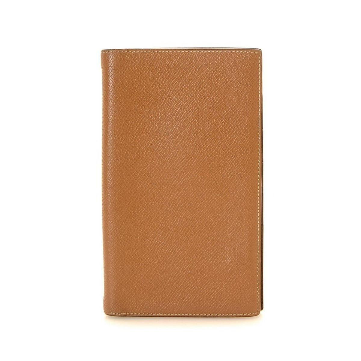 Hermes Camel Leather Flip Wallet with gold-tone hardware, brown leather trim, interior flap pockets, leather lining, bifold closure. Measurements: Length: 0.25 in / 1 cm Width: 4 in / 10 cm 7.25 in / 18 cmCONDITION: Pre-Owned Good overall, please see photographs for detail.