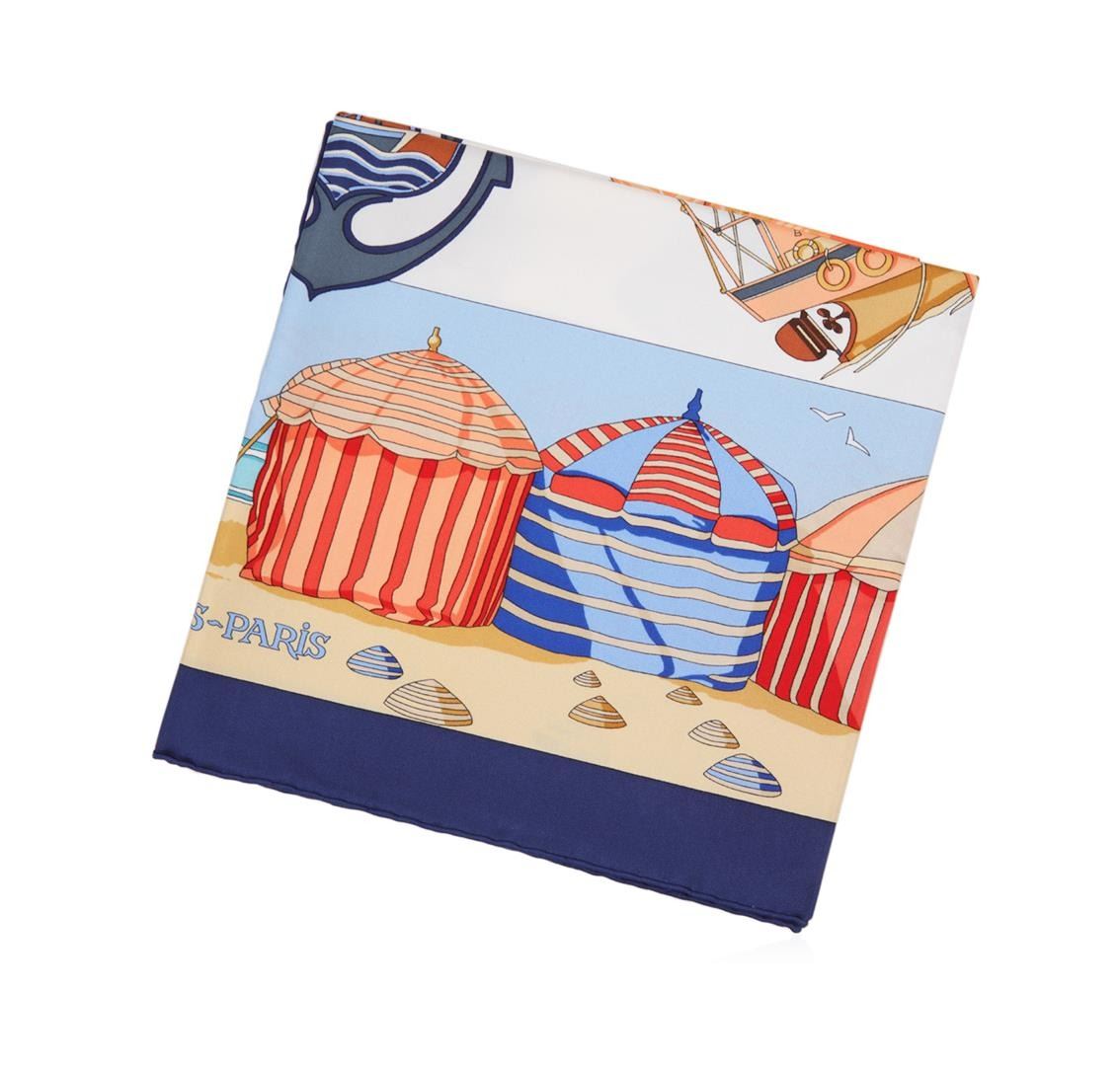 One Hermes silk scarf in good condition, measuring 90cm by 90cm. The scarf features the 'Charmes Des Plages Normades' by artist Loic Dubigeon. The design features images relating to the beaches and beautiful area of Normandy, with vibrant blues, yellows, oranges and reds set against a beige beach scene with a deep blue border. Comes in an Hermes scarf box.