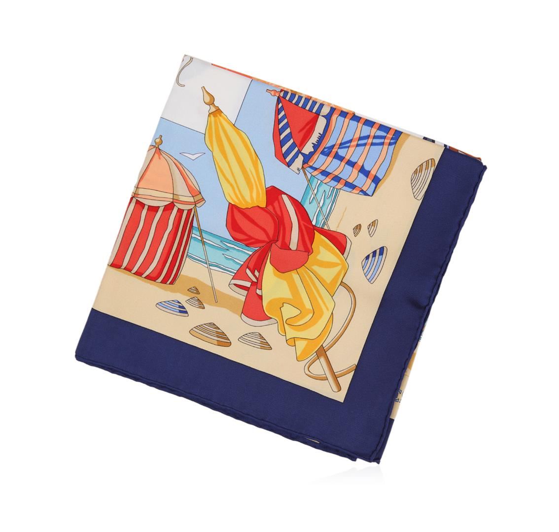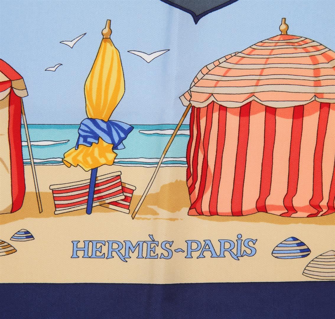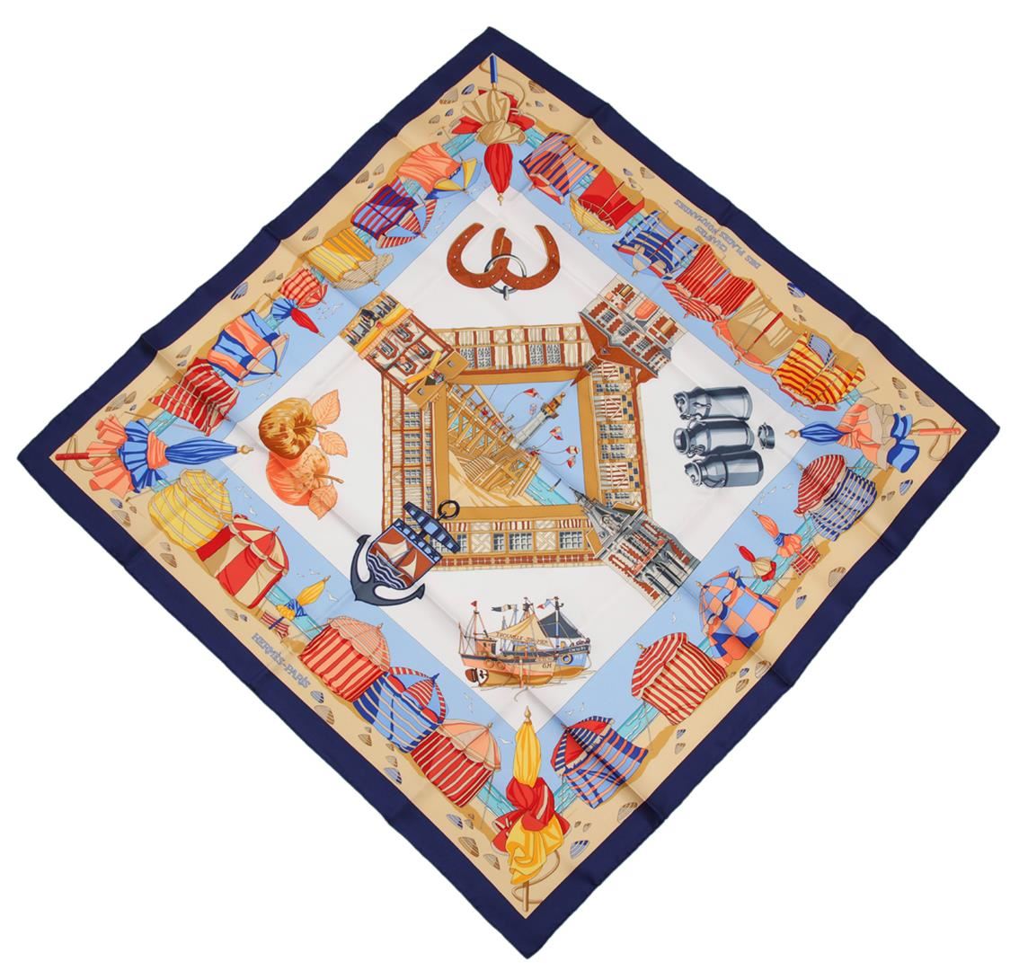 One Hermes silk scarf in good condition, measuring 90cm by 90cm. The scarf features the 'Charmes Des Plages Normades' by artist Loic Dubigeon. The design features images relating to the beaches and beautiful area of Normandy, with vibrant blues, yellows, oranges and reds set against a beige beach scene with a deep blue border. Comes in an Hermes scarf box.