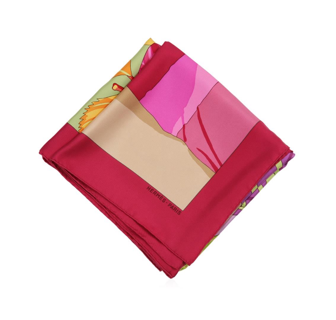 One Hermes silk scarf in good condition, measuring 90cm by 90cm. The scarf features the 'Charmes Des Plages Normandes II' design by artist Loic Dubigeon. The design is of a vivid beach scene and apples, featuring bright magenta, green and orange hues. Comes with an Hermes scarf box.