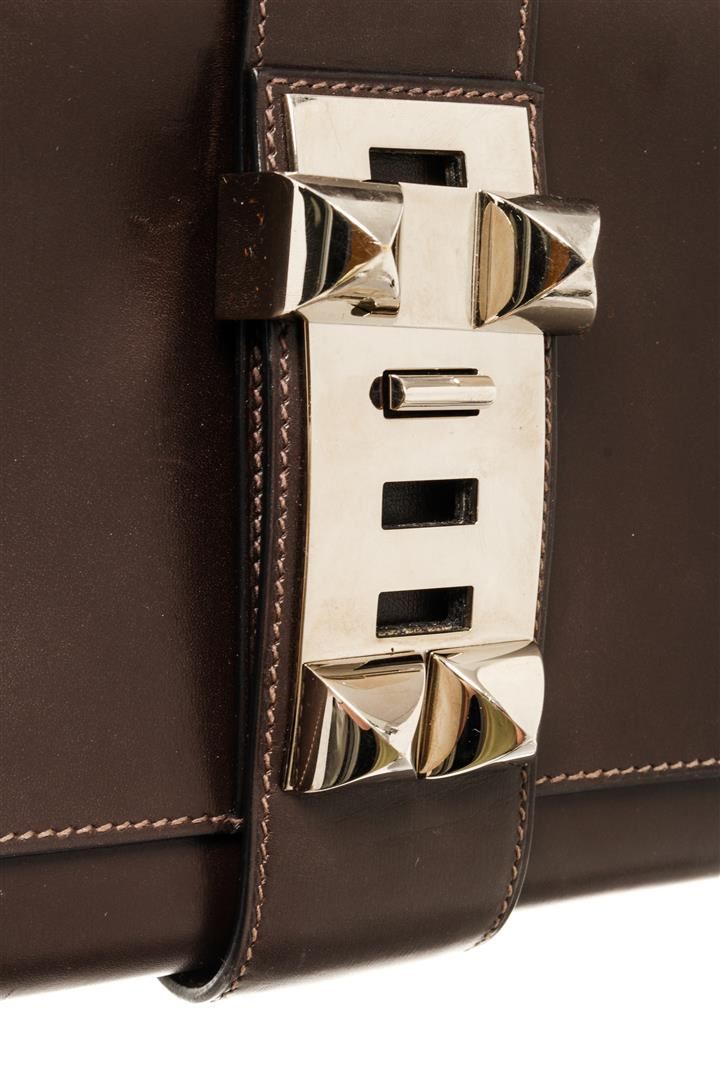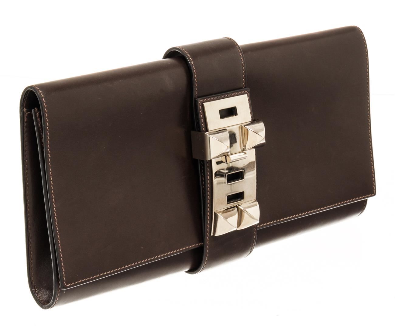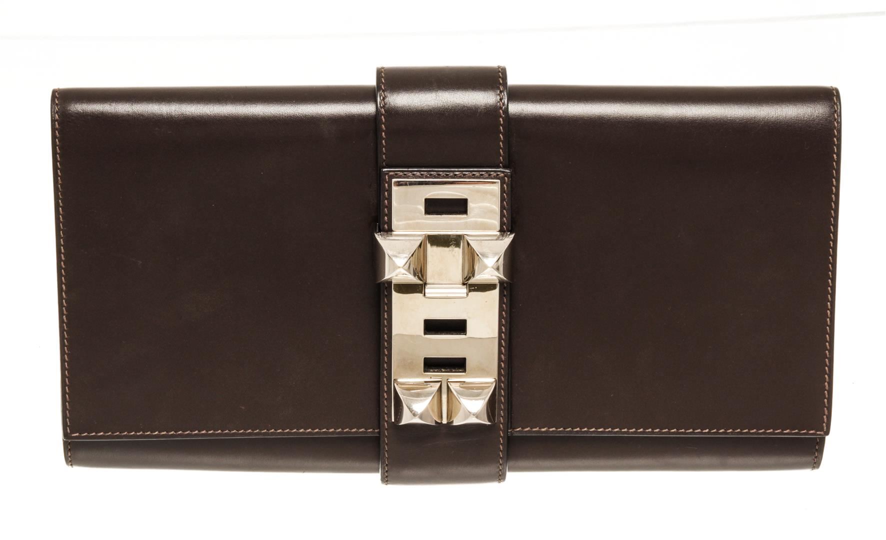 One Hermes Chocolate Box Calfskin Medor 29. Item is sold AS-IS. All available information is listed in the description and shown in the photo. Hermes Chocolat Box Calfskin Medor 29. Features palladium plated hardware, brown leather interior with 1 pocket, and a clasp closure.