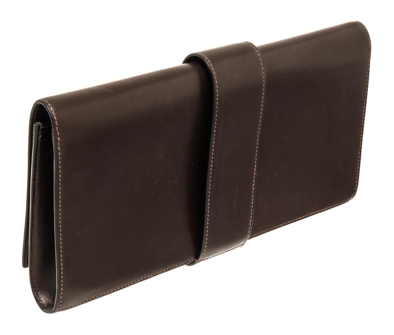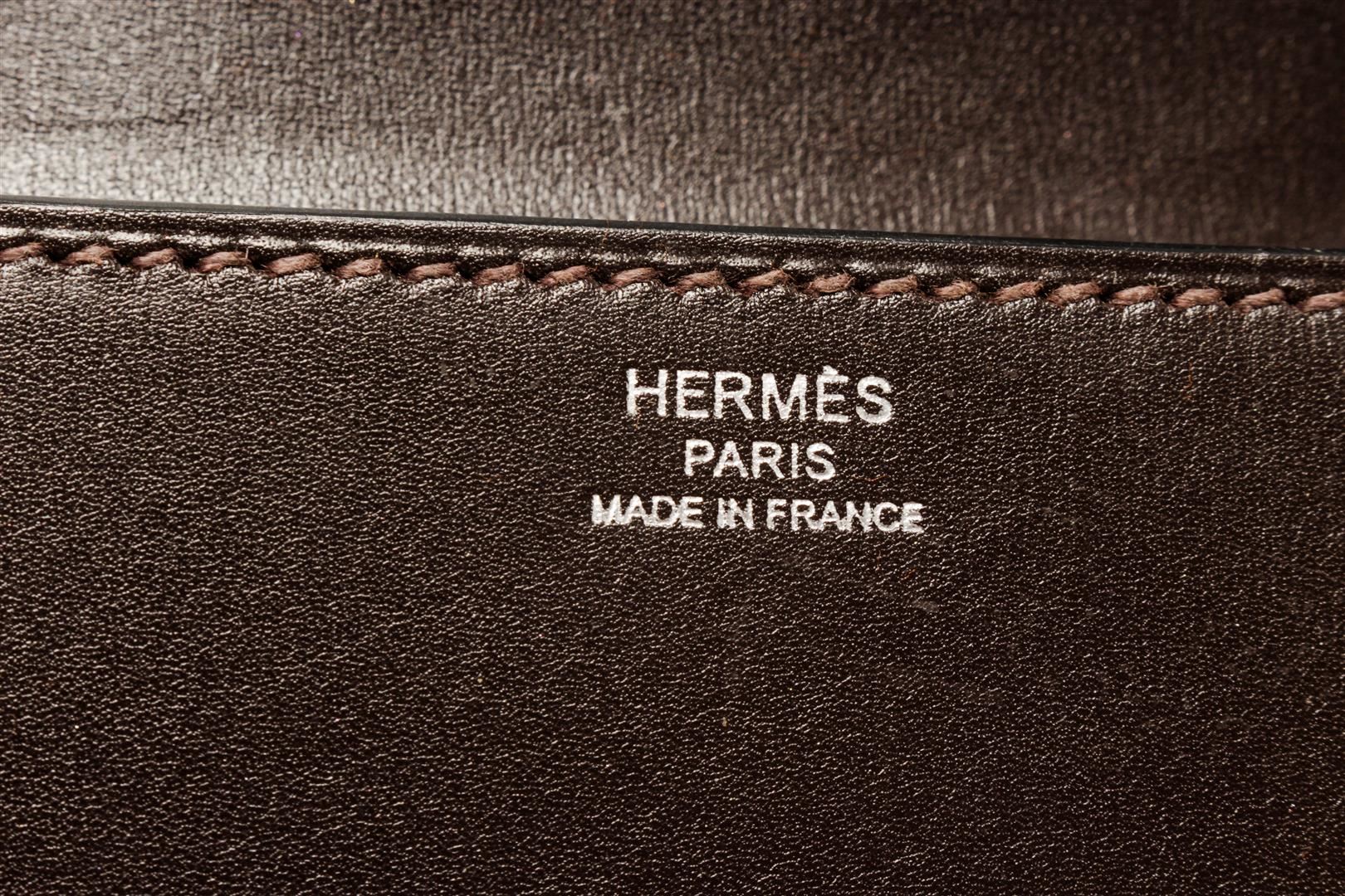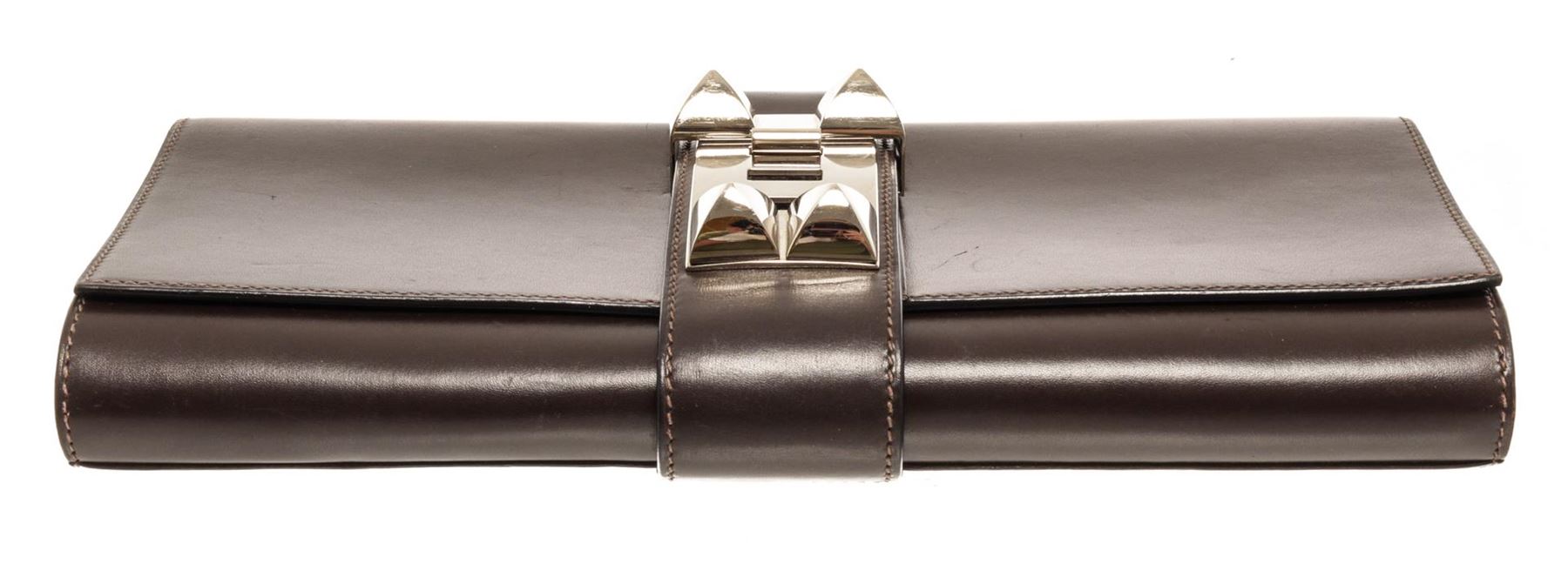 One Hermes Chocolate Box Calfskin Medor 29. Item is sold AS-IS. All available information is listed in the description and shown in the photo. Hermes Chocolat Box Calfskin Medor 29. Features palladium plated hardware, brown leather interior with 1 pocket, and a clasp closure.