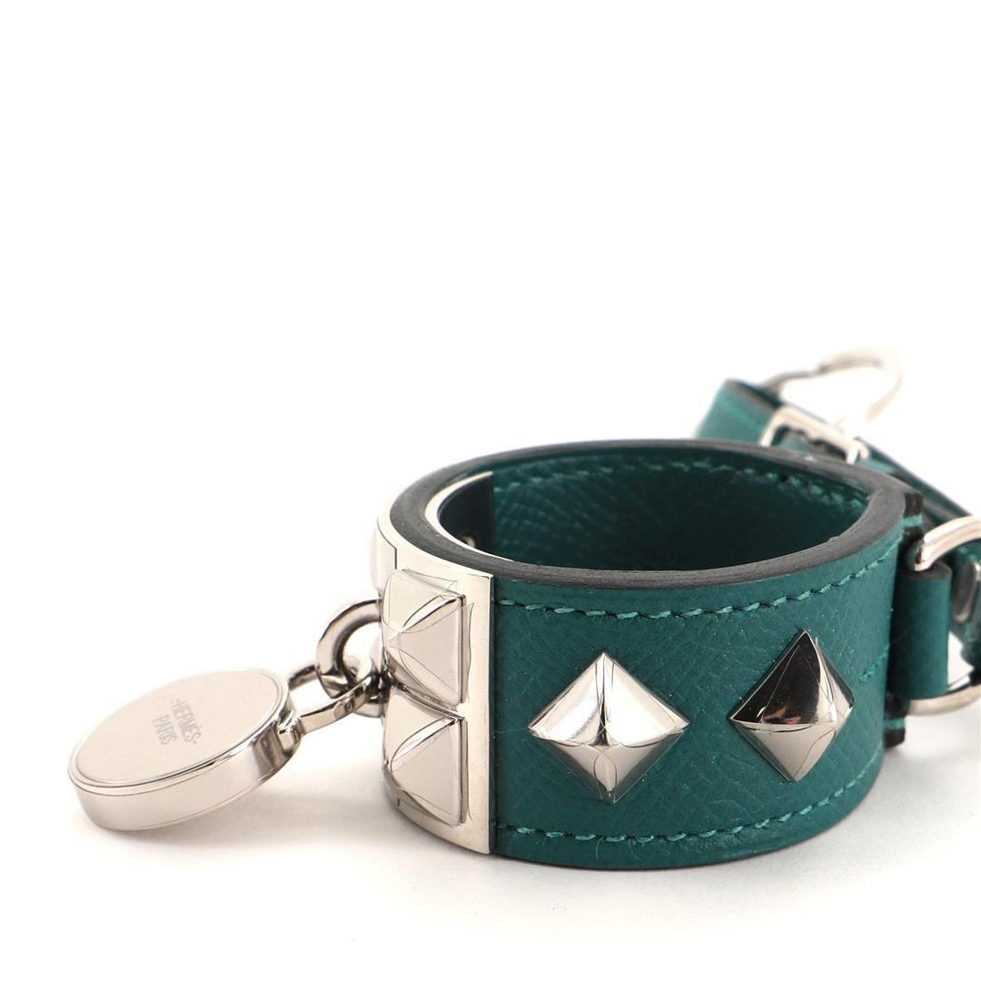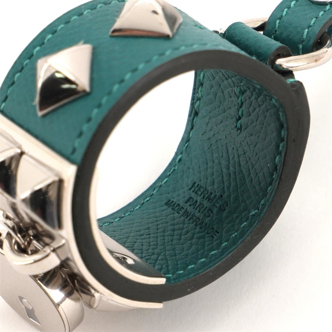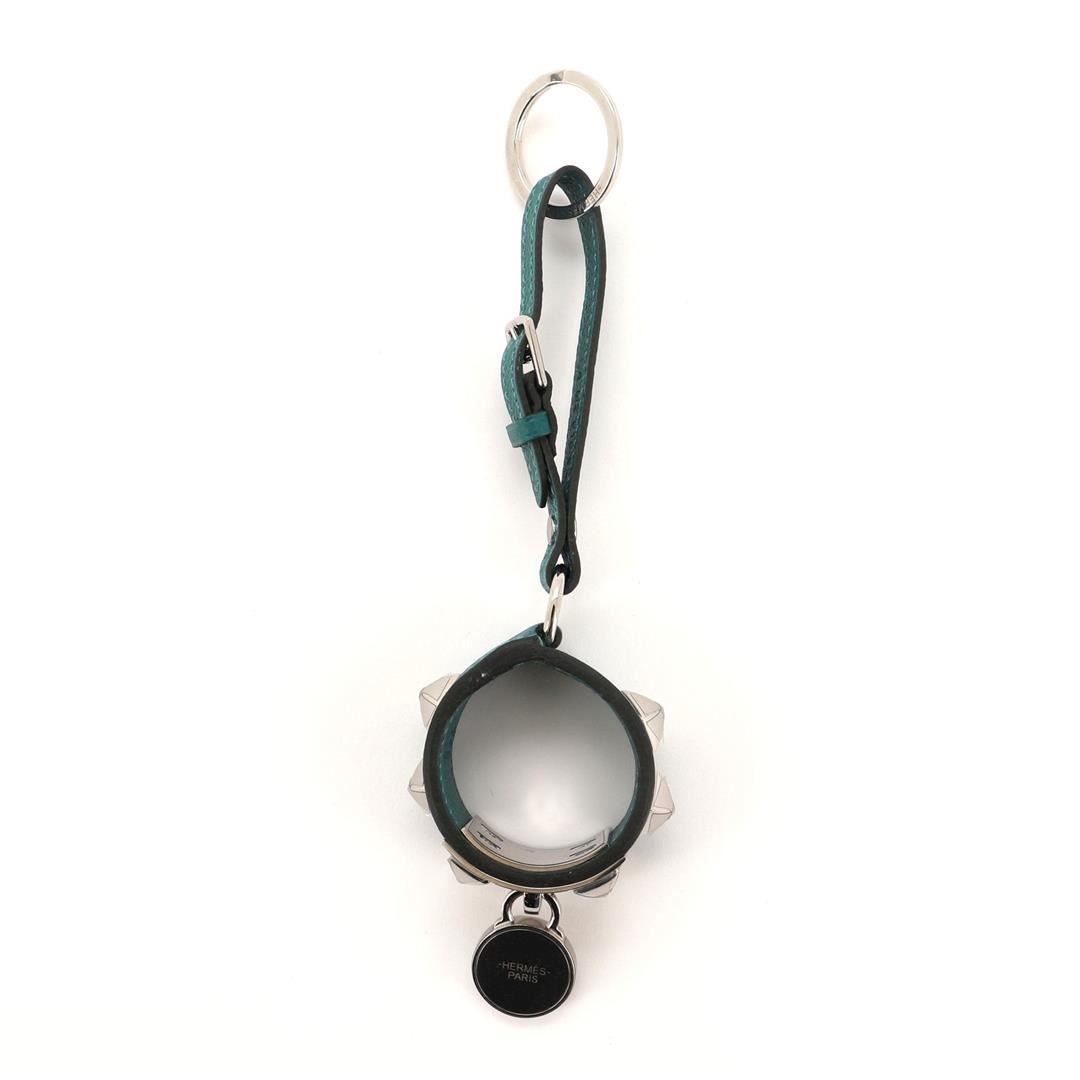 One Hermes Collier de Chien Anneau Keychain Studded Leather Green. Item is sold AS-IS. All available information is listed in the description and shown in the photo. Hermes Collier de Chien Anneau Keychain Studded Leather Green Stud Leather Condition Details: Faint scratches on hardware. Height 6.5", Width 2", Depth ", Strap Drop None