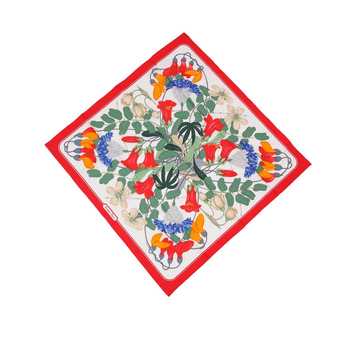One Hermes cotton scarf in good condition, measuring 60cm by 60cm. The scarf features the 'Flora Graeca' design by Niki Goulandris. The design features vibrant flowers in orange, blue, green and red hues set against a light background and bordered with a deep red trim.