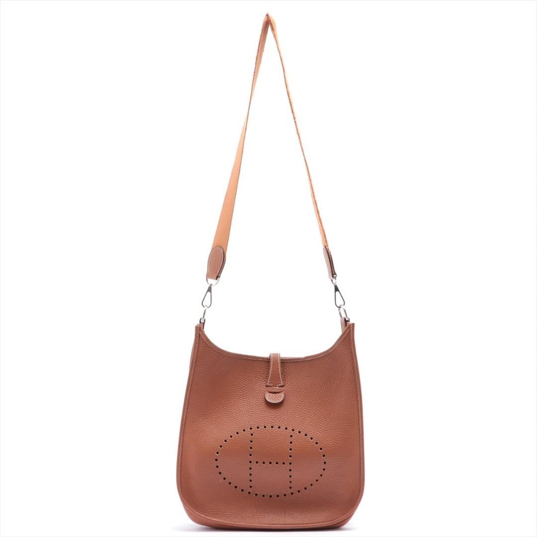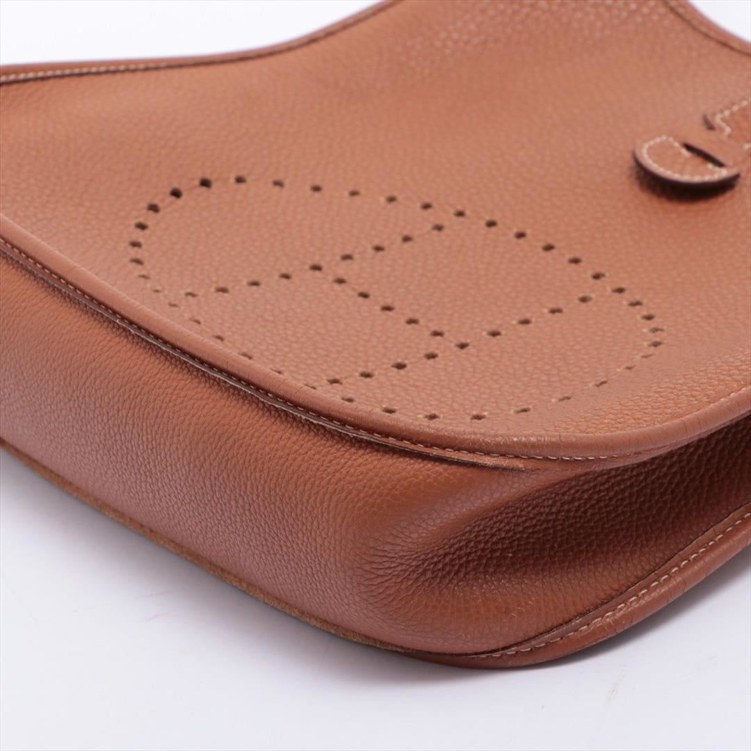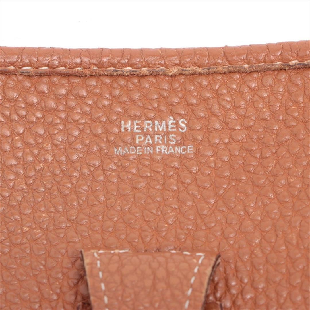 Hermes gold clemence leather Evelyn 1 PM bag with silver-tone hardware, tonal suede lining, perforated logo on front, snap closure at back, flat canvas shoulder strap.