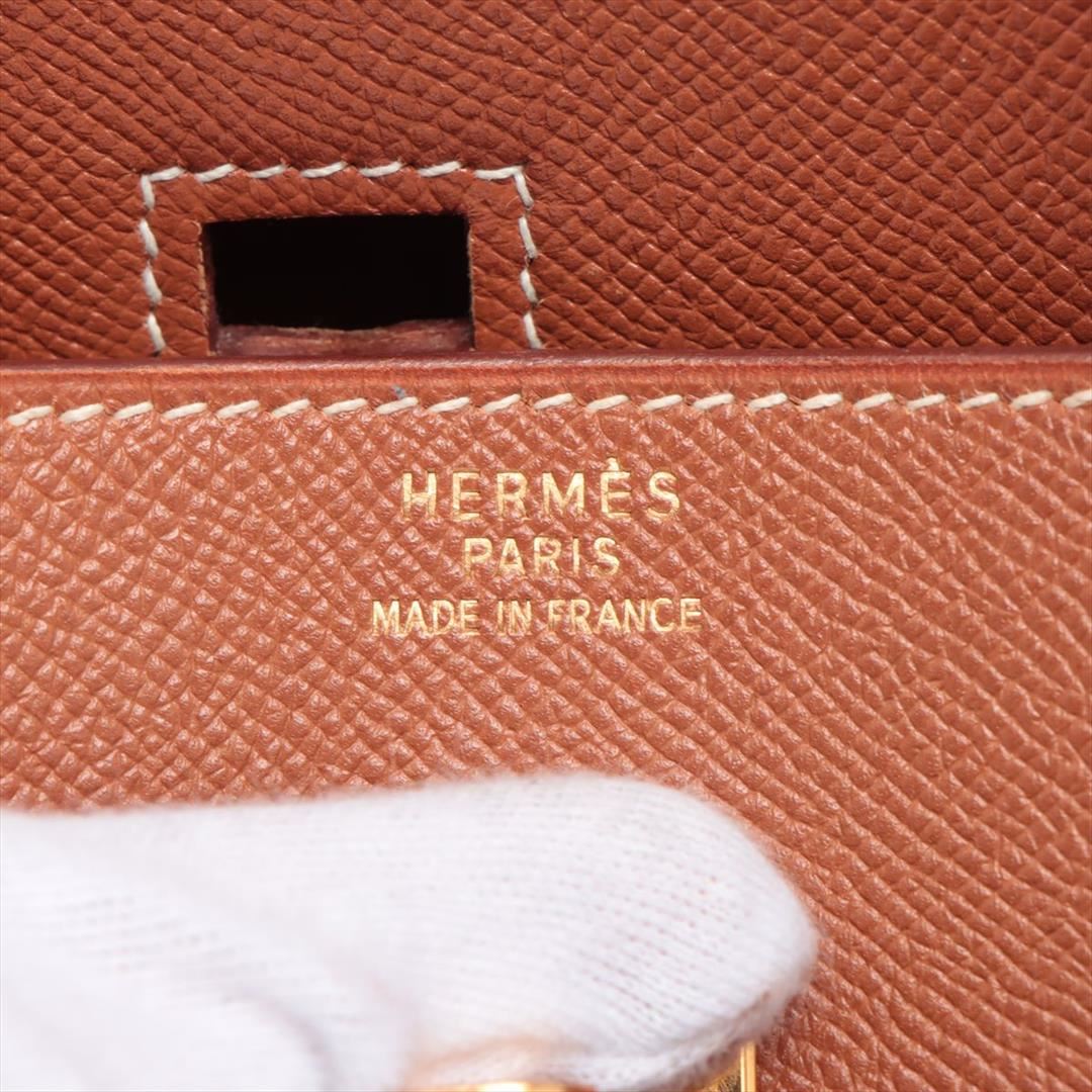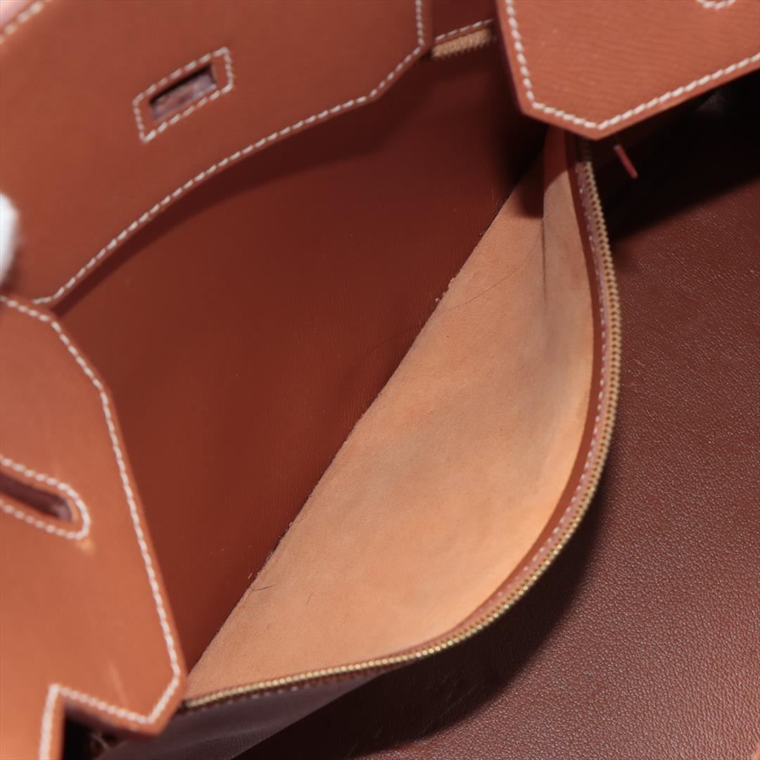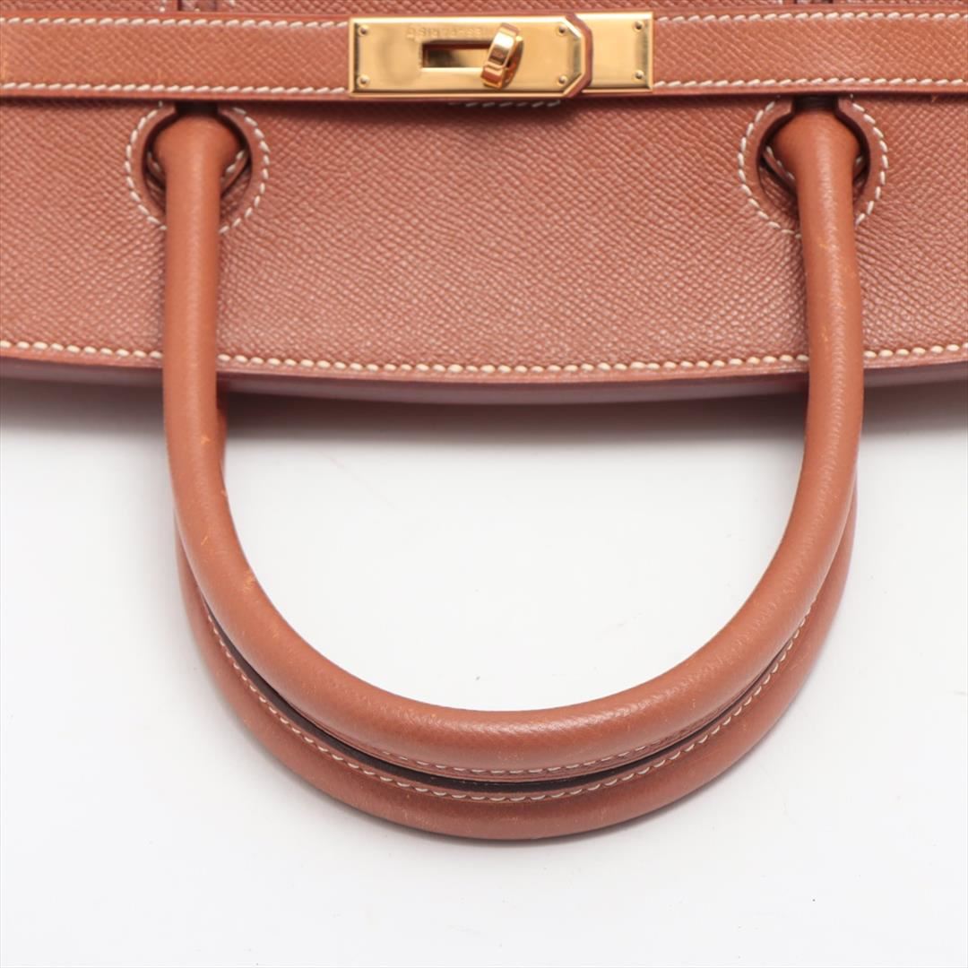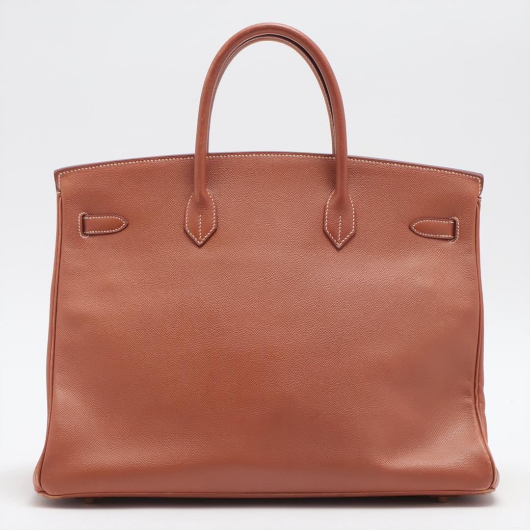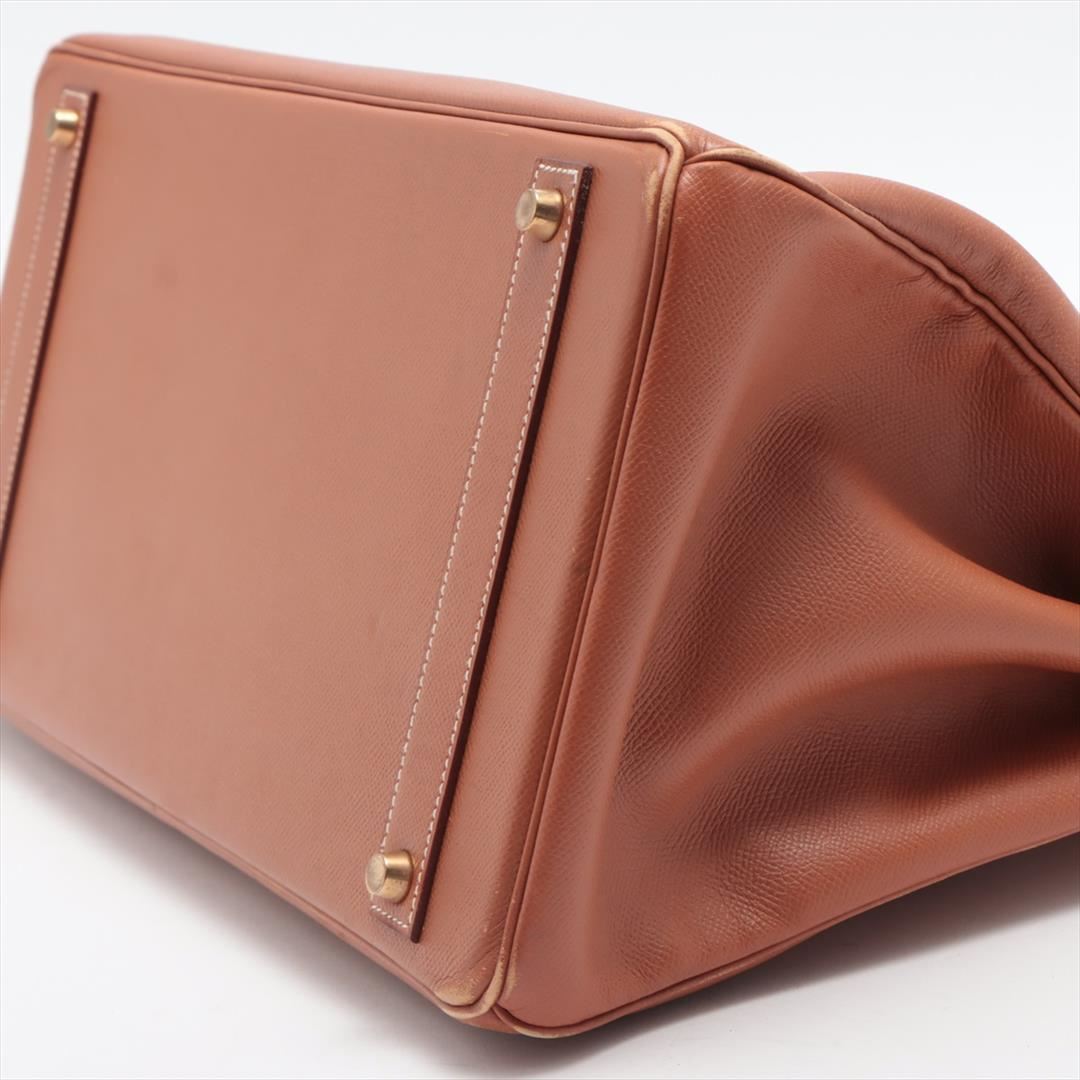 Gold Courchevel leather Hermes Birkin 40cm handbag with gold-tone hardware, front clasp stamped with HERMES-PARIS, an engraved turn-lock, four protective feet on the base, double rolled leather handles, white stitching, brown leather lining, a slip pocket