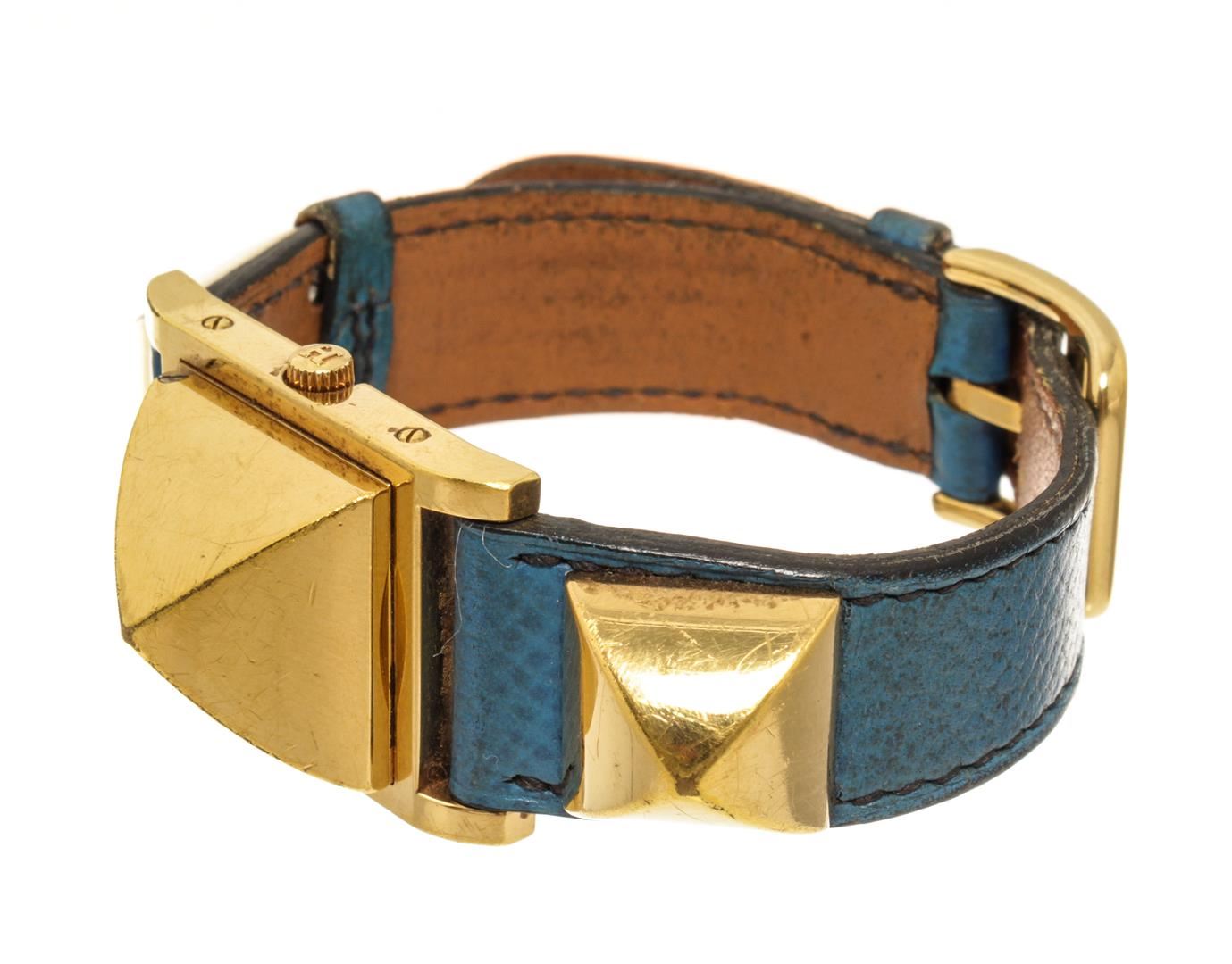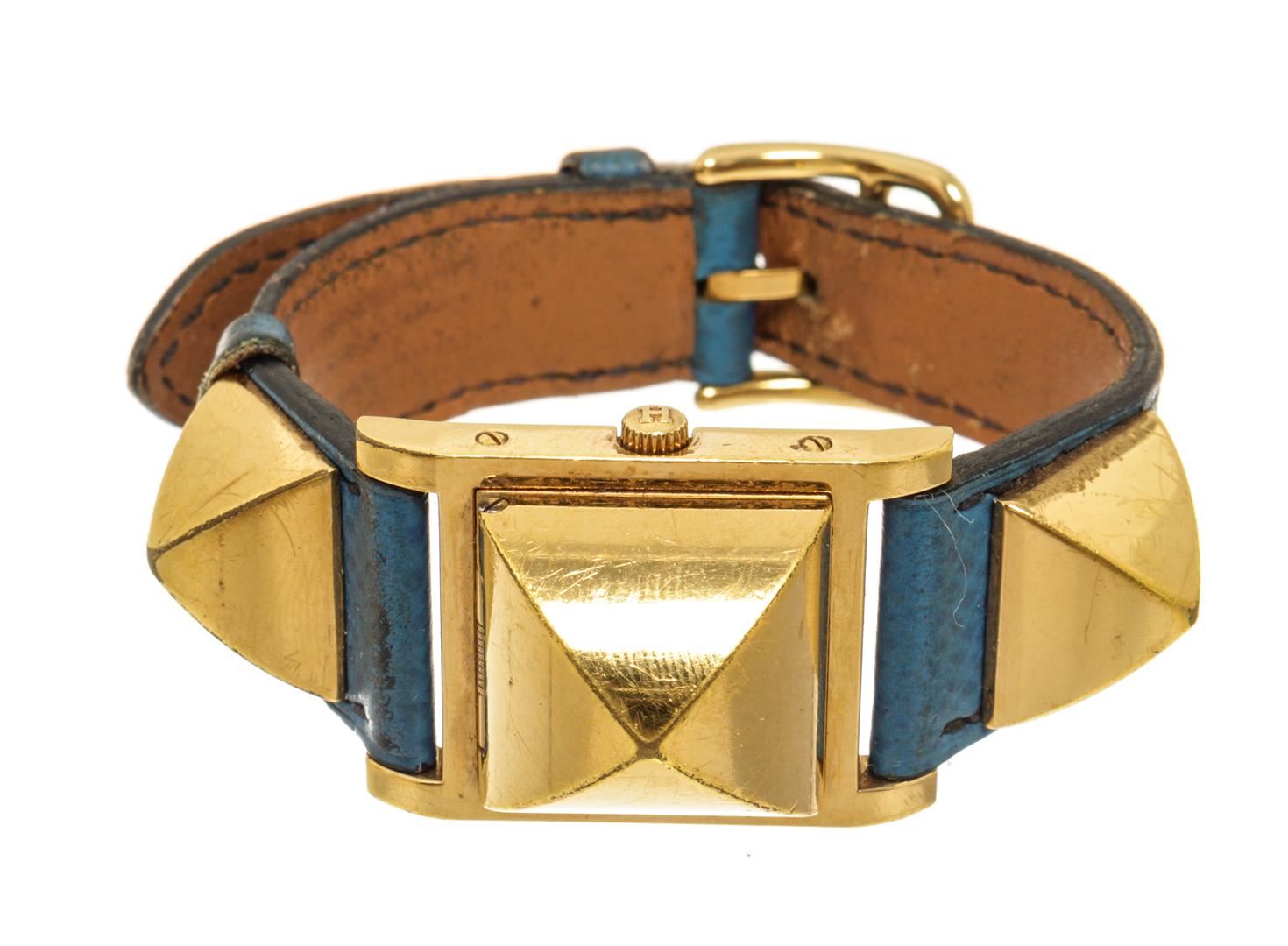 One Hermes Gold Plated Metal and Leather Medor Quartz 18mm Watch. Item is sold AS-IS. All available information is listed in the description and shown in the photo. Hermes Gold Plated Metal and Leather Medor Quartz 18mm Watch with band material leather, case material plated 18k yellow gold, movement quartz, Width: 23mm, Height: 16mm, Band Width: 18mm