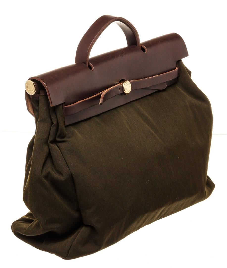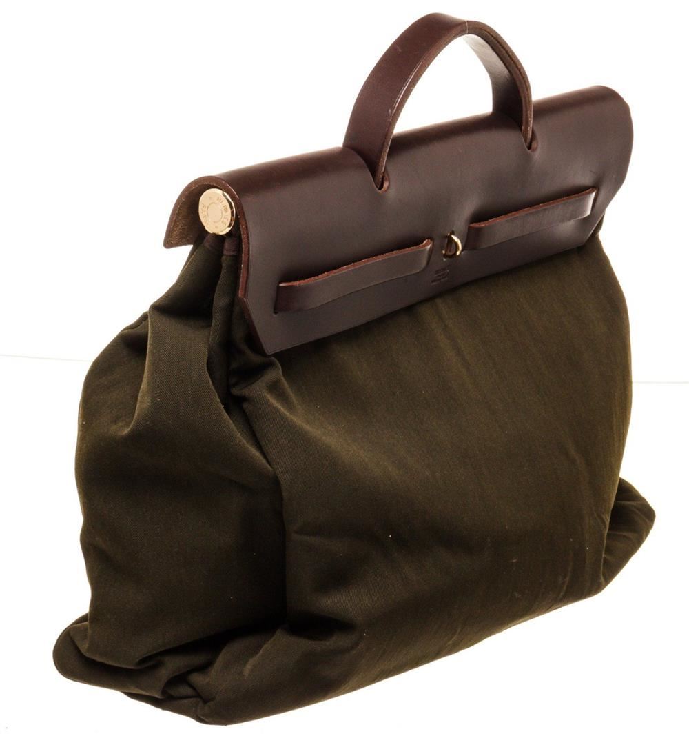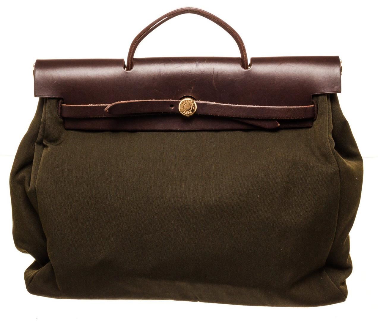 Hermes Green Canvas Herbeg GM Messenger Bag with palladium-plated hardware, tonal Vache Hunter leather trim, single layered top handle, single flat shoulder strap, tonal Toile interior and pull-through closure at front flap. Blind stamped C in Square.