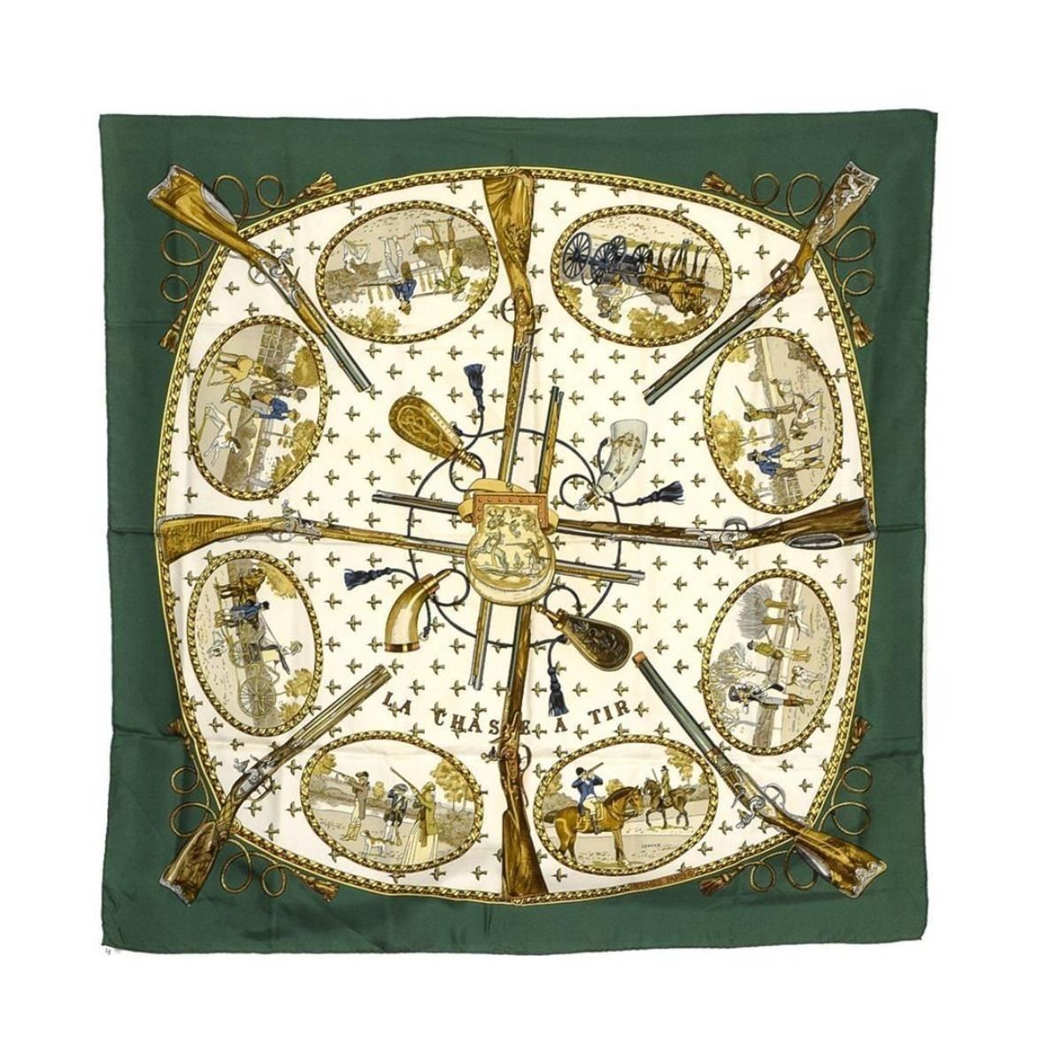 Hermes Green La Chasse Afrique Tir HU Silk Scarf with silver-tone hardware, hand-rolled edges. Measurements: Length: 36 in / 91 cm Width: 36 in / 91 cm 1 in / 3 cmCONDITION: Pre-Owned Good overall, please see photographs for detail.
