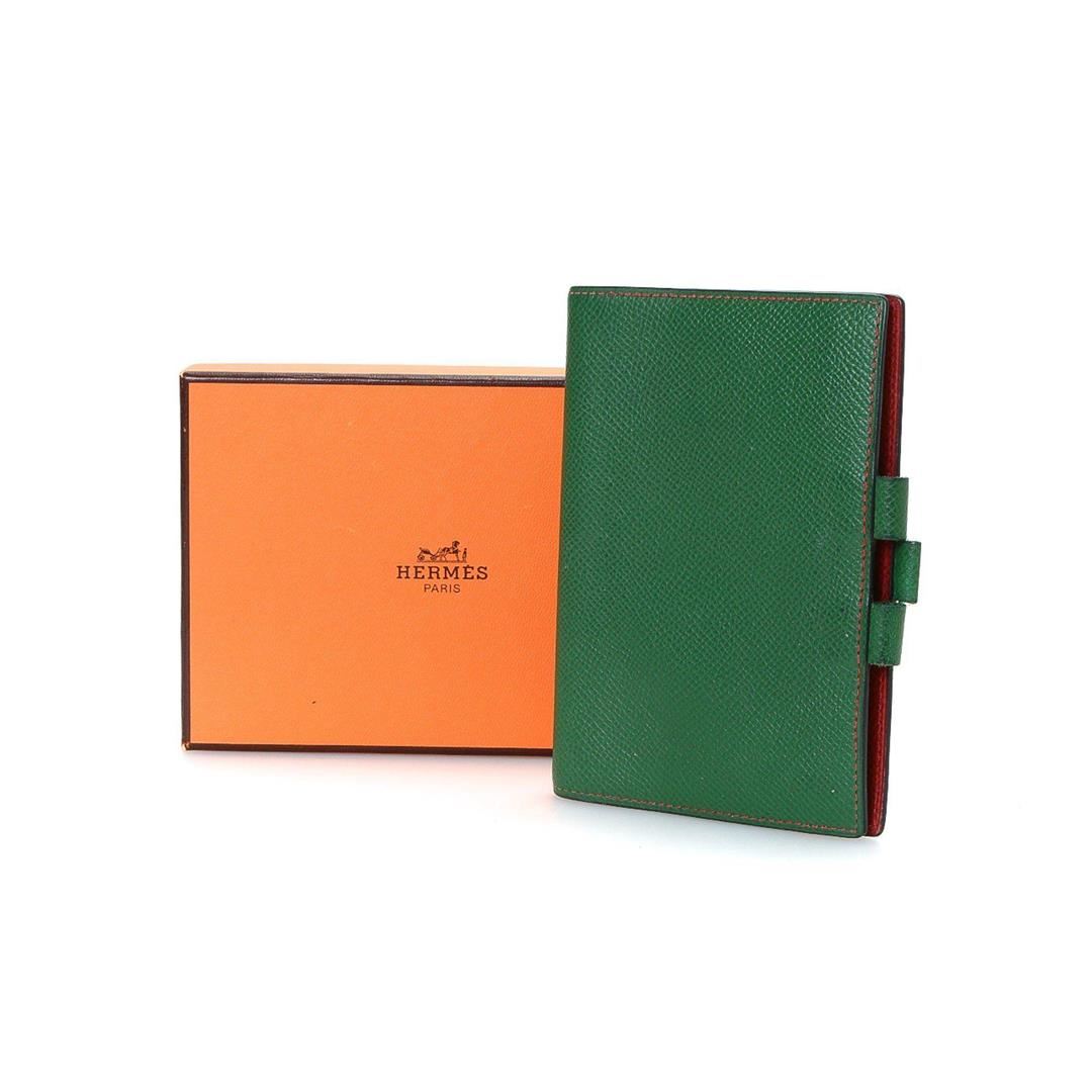 Hermes Green Leather Agenda Cover PM Wallet with silver-tone hardware, leather Hermes Vision agenda cover with interior slit pockets, at interior, and brand stamp at interior, snap closure. Measurements: Length: 0.5 in / 1 cm Width: 4 in / 10 cm 1 in / 3 cm Condition: Pre-Owned Good overall, please see photographs for detail.