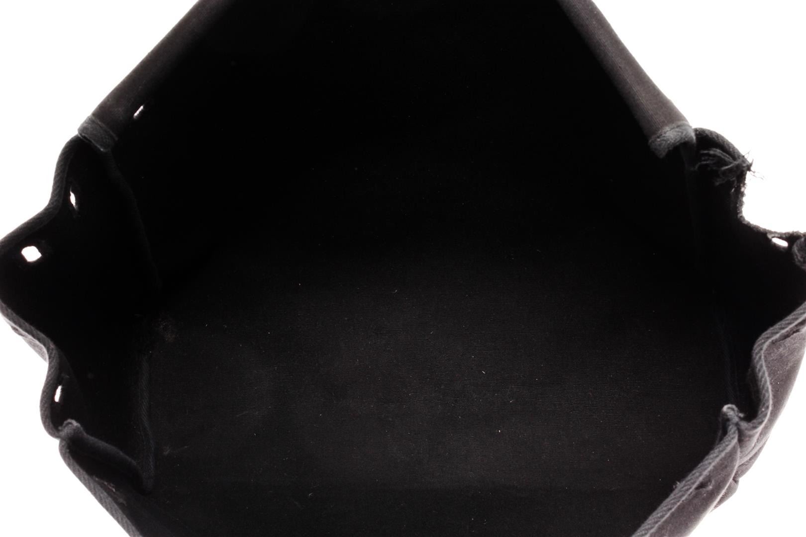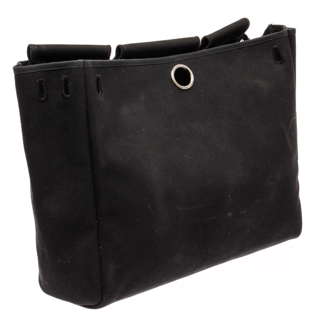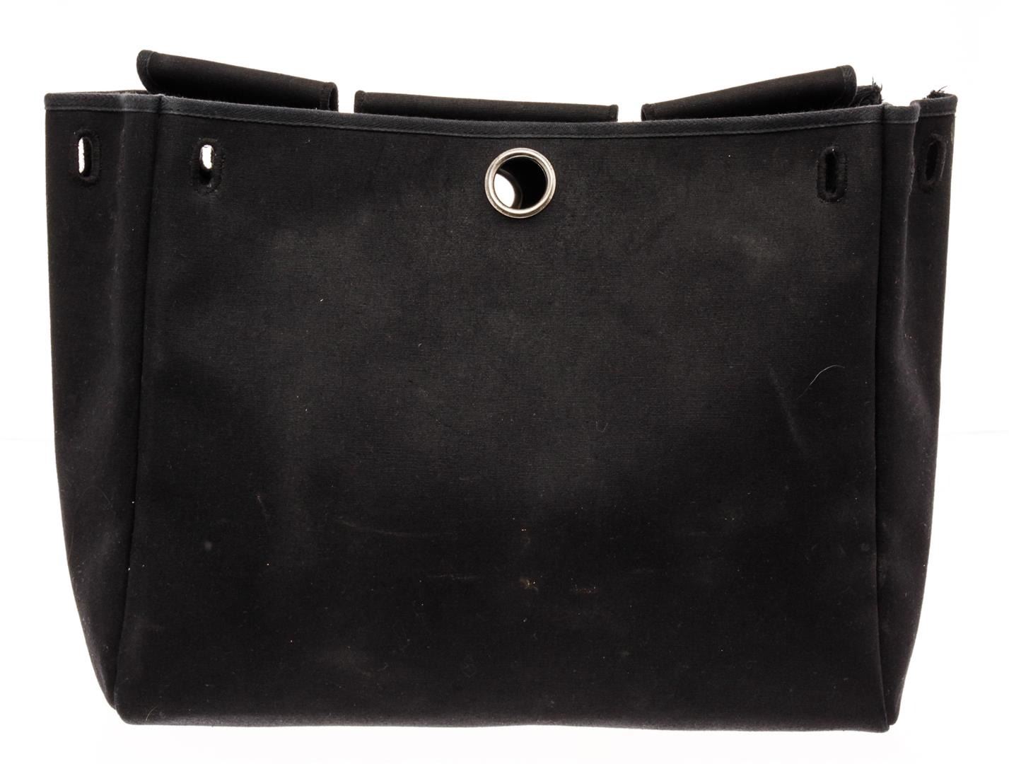 Hermes Her Bag Base Handbag Black Canvas. Brand: Hermes, Style: Her Bag Base, Type: Handbag, Exterior Color: Black, Exterior Material: Canvas, Exterior Pockets: None, Interior Color: Black, Interior Material: Canvas, Interior Pockets: None, Closure: Open, Length: 15", Width: 4 1/2", Height: 13". Condition: Worn with markings, tear in the back top. Additional Information: This is an optioN/Al slipt to a Hermes Her Bag, the leather top handle/closure is not included with this item. Item is sold AS-IS and all information pertaining to this lot is available in the photos or this description.