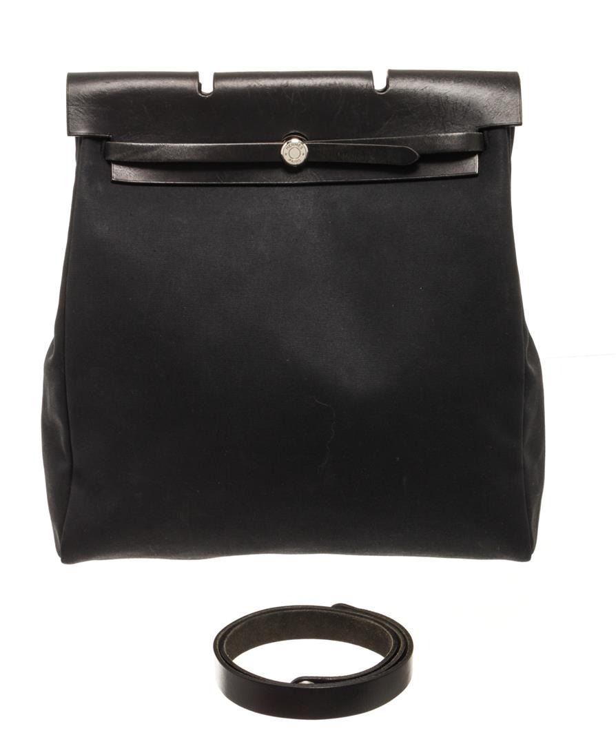 Hermes Herbag GM Crossbody fabric. Brand: Hermes, Style: Herbag GM, Type: Crossbody, Exterior Color: N/A, Exterior Material: fabric, Exterior Pockets: None, Interior Color: Black, Interior Material: fabric, Interior Pockets: one, Closure: flap, Handle/Strap Type: leather, Length: 14", Width: 4 1/2", Height: 16", Handle Drop: 2", Strap Drop: 17 1/2". Condition: light fading and scratches on leather. Item is sold AS-IS and all information pertaining to this lot is available in the photos or this description.