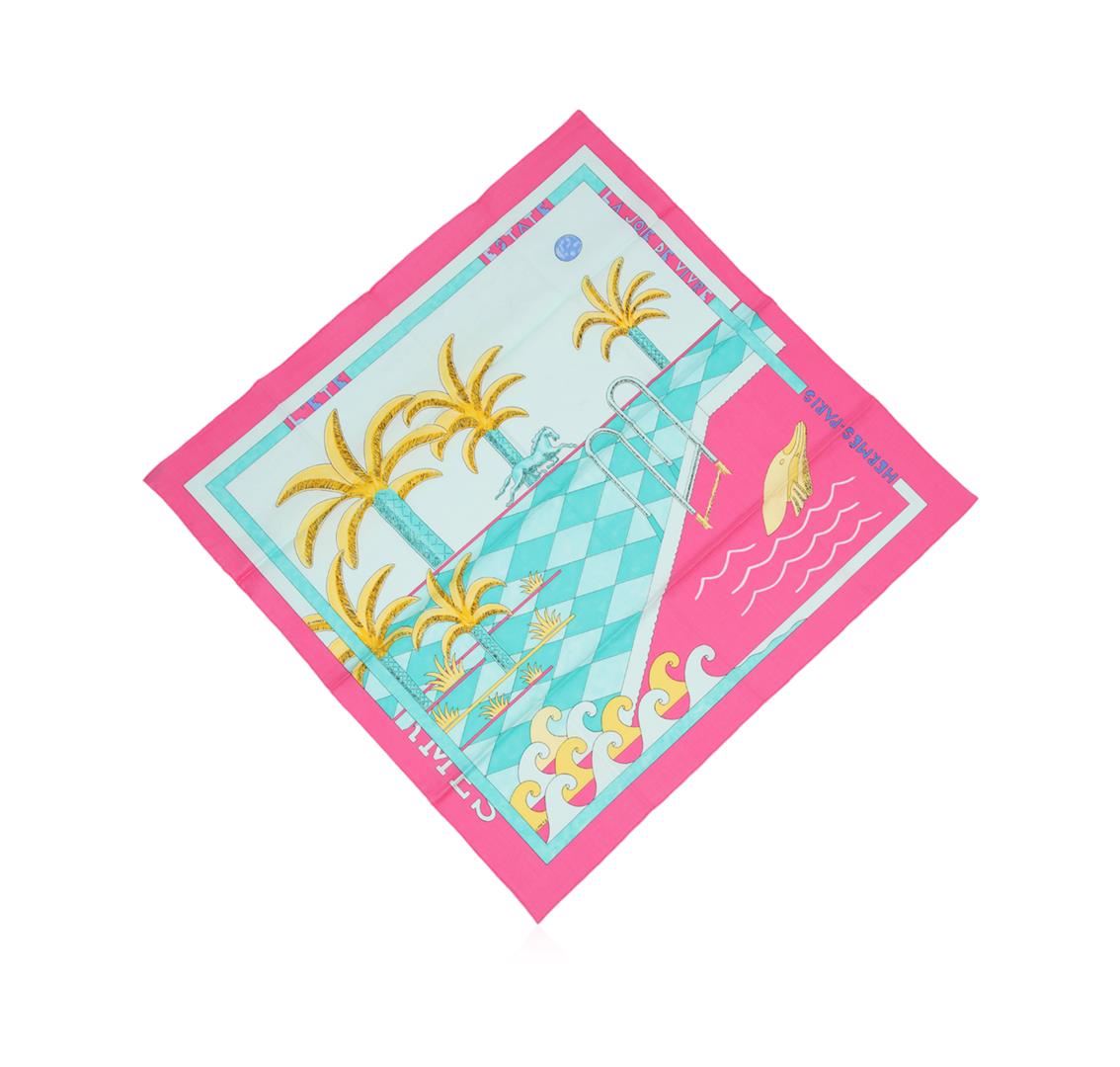 One Hermes cotton scarf in good condition, measuring 60cm by 60cm. The scarf features the 'Joie de Vivre' design by artist Joachim Metz. The design features various summer motifs in blue, pink, green and yellow hues with a pink border.