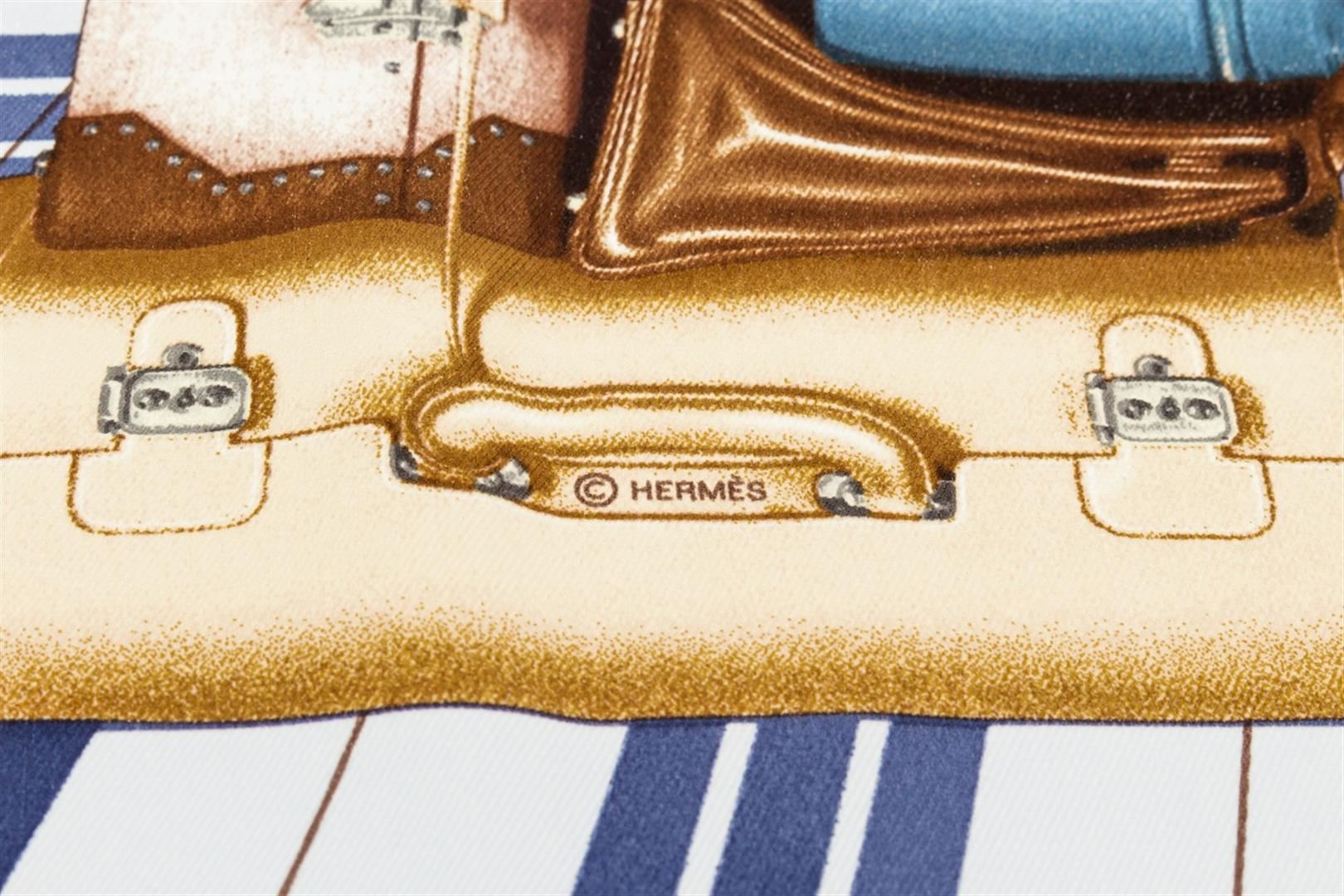 One Hermes Multicolor H en Voyage 70 Silk Scarf. Item is sold AS-IS. All available information is listed in the description and shown in the photo. hermes multicolor h en voyage 70 silk scarf with a veritable monolith of hermes luggage. Width: 27.56" Length: 27.56