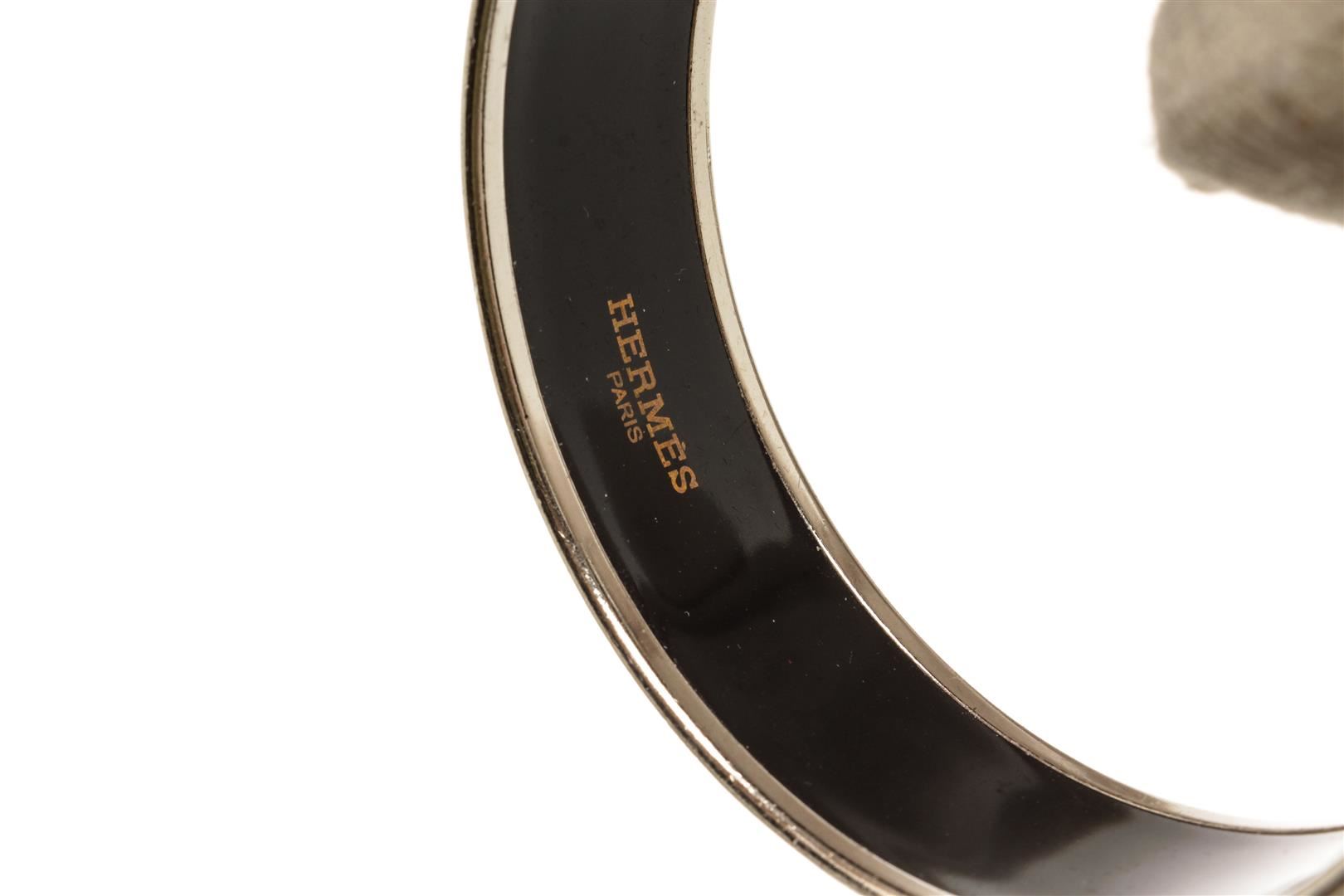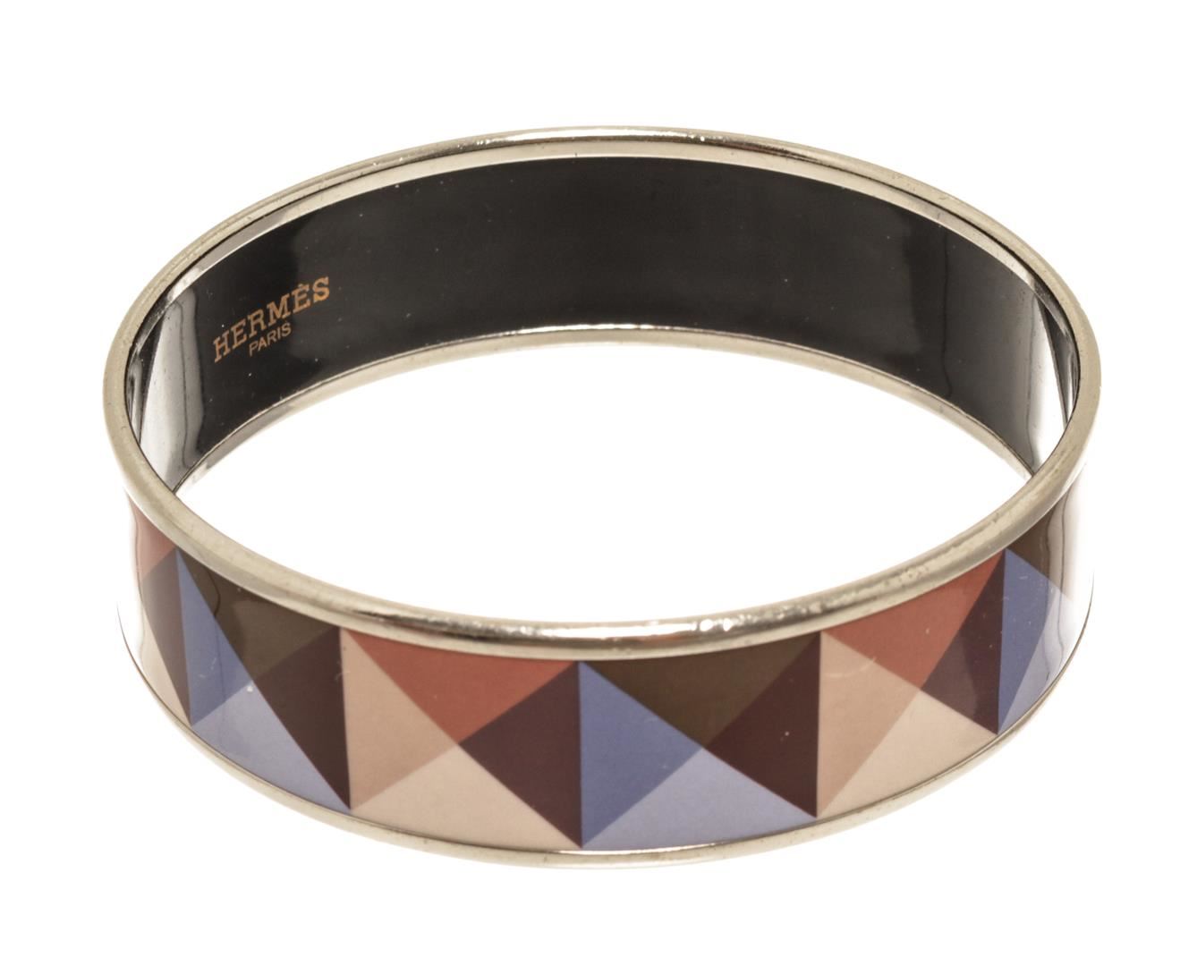 One Hermes Multicolored Enamel Bangle Bracelet. Item is sold AS-IS. All available information is listed in the description and shown in the photo. Hermes Multicolored Enamel Bangle Bracelet with this unique cuff has a silver rim with an inner black inlay. this bangle is enameled with a detailed geometric pattern. the look of this bracelet is elegant and unique and will add flair to your outfit from hermes!