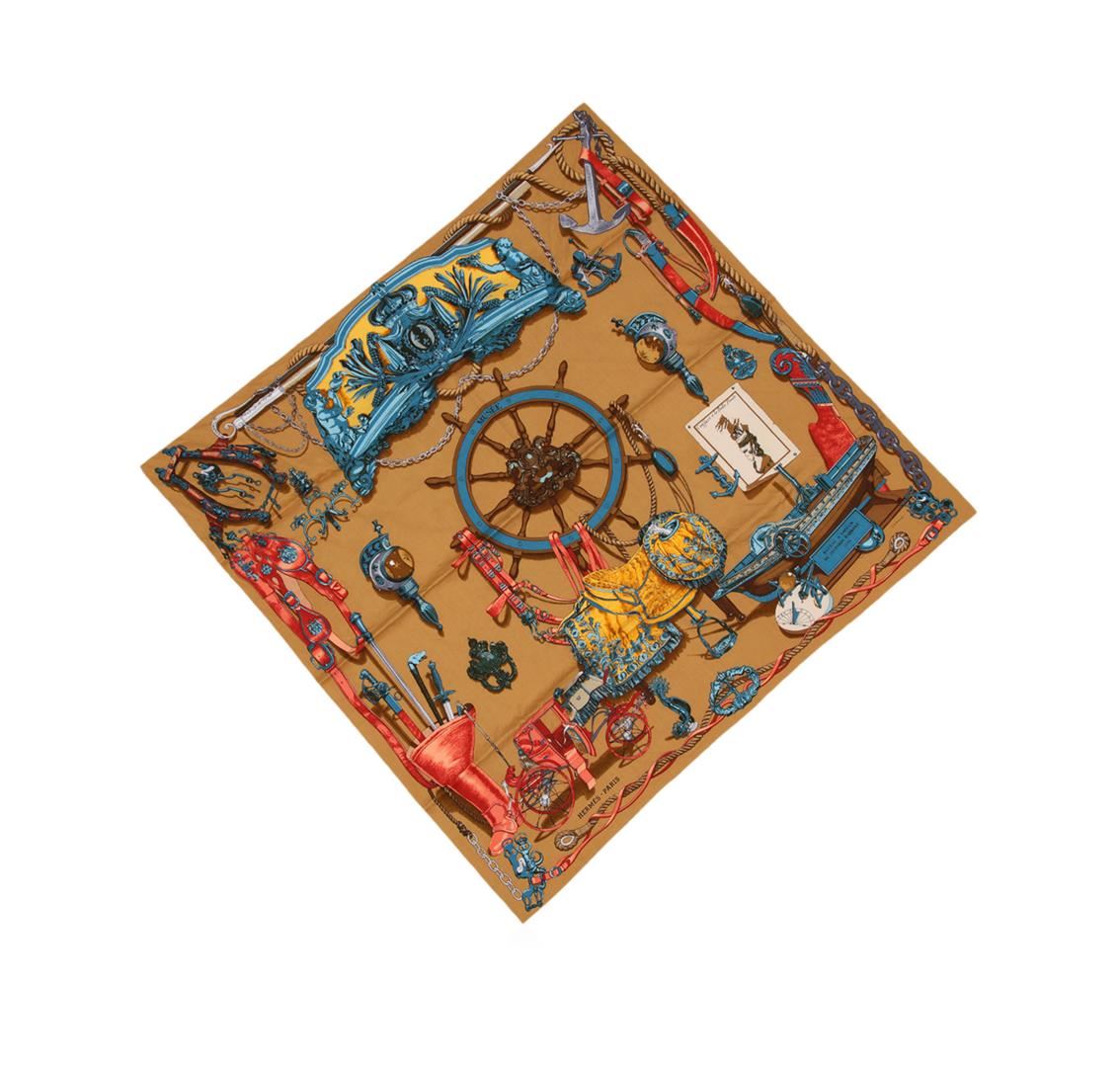 One Hermes cotton scarf in good condition, measuring 60cm by 60cm. The scarf features the 'Musee' design by artist Philippe Ledoux. The design features various nautical themed items framed by braided rope and chains, set against a dark beige background. Comes with an Hermes scarf box.