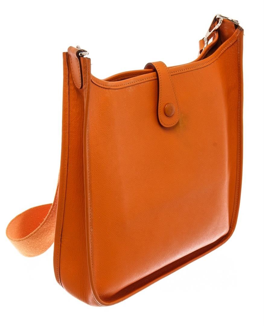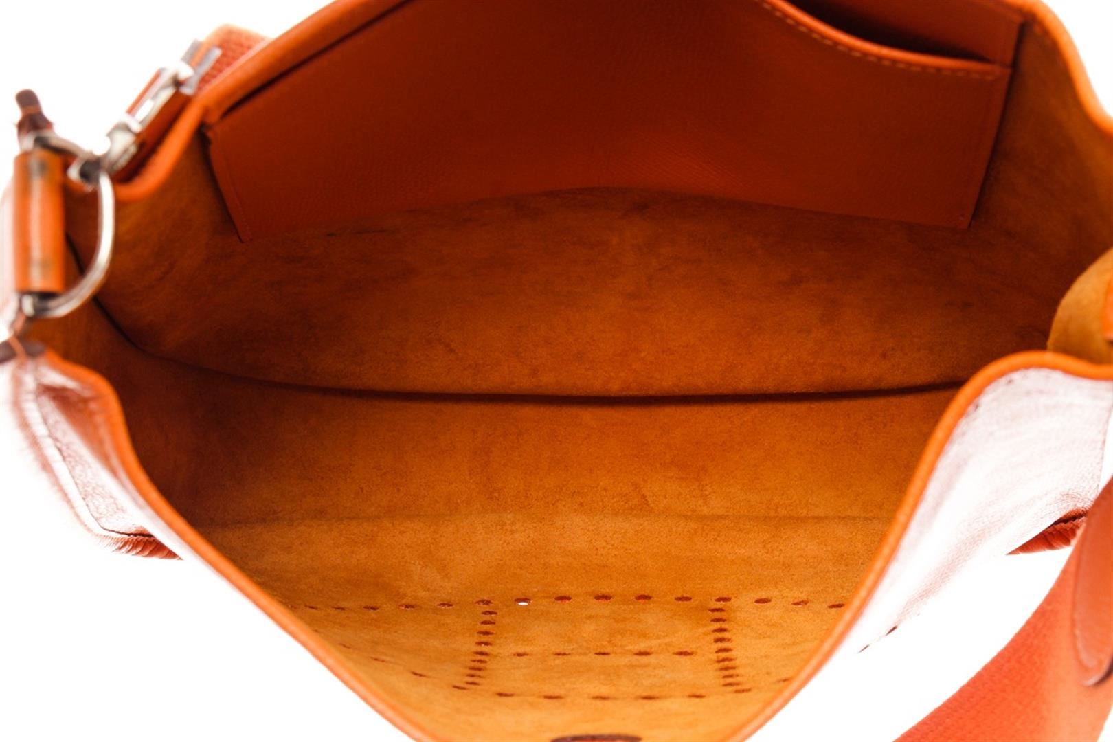 Hermes Orange Epsom Leather Evelyne GM Hobo Bag. All available information is listed in the description and shown in the photos. Hermes Orange Epsom Leather Evelyne GM Hobo Bag with orange d'h epsom leather, palladium-plated hardware, single adjustable shoulder strap, grosgrain & lasercut accents, single exterior pocket, suede lining, includes dust bag, snap closure at back. Height: 11" Width: 12" Depth: 2.5", Shoulder Strap Drop: 19.25" / 27.94 x 30.48 x 6.35 Cm