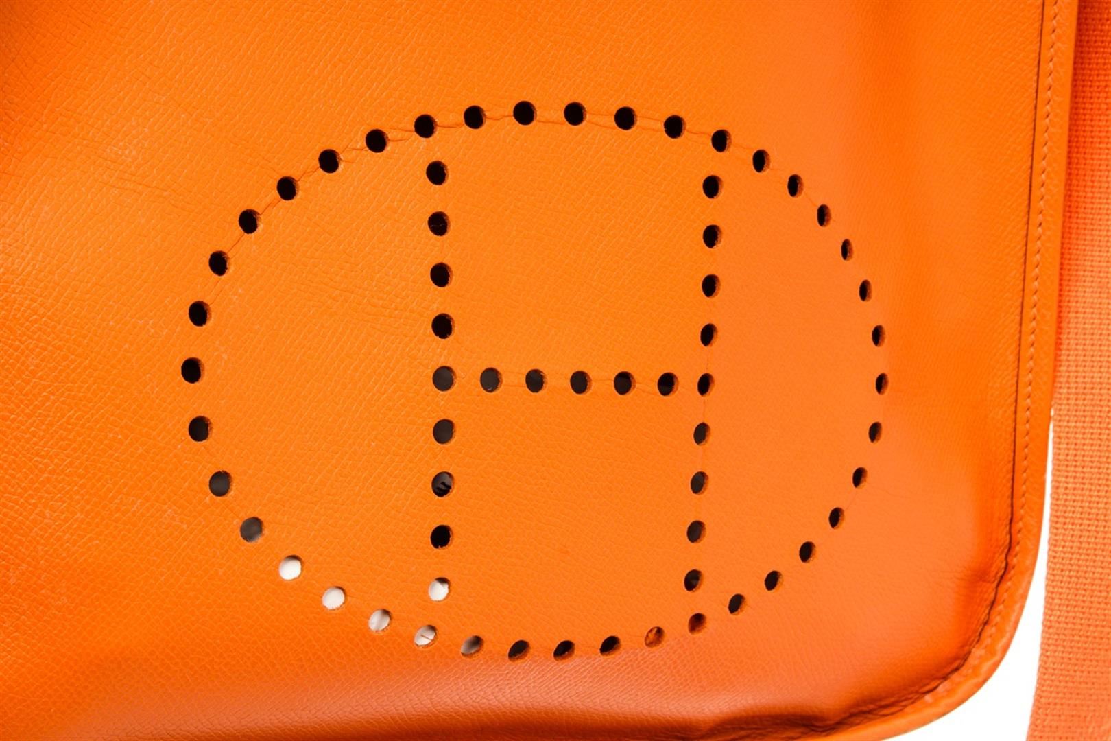 Hermes Orange Epsom Leather Evelyne GM Hobo Bag. All available information is listed in the description and shown in the photos. Hermes Orange Epsom Leather Evelyne GM Hobo Bag with orange d'h epsom leather, palladium-plated hardware, single adjustable shoulder strap, grosgrain & lasercut accents, single exterior pocket, suede lining, includes dust bag, snap closure at back. Height: 11" Width: 12" Depth: 2.5", Shoulder Strap Drop: 19.25" / 27.94 x 30.48 x 6.35 Cm