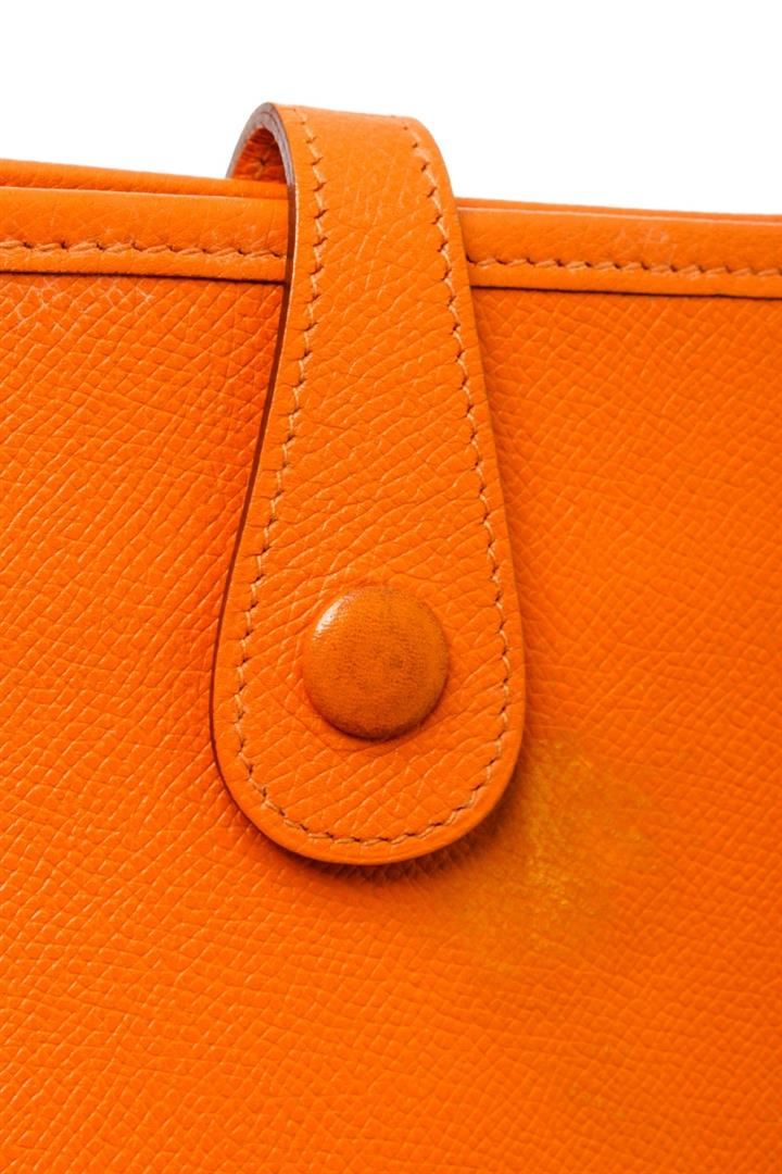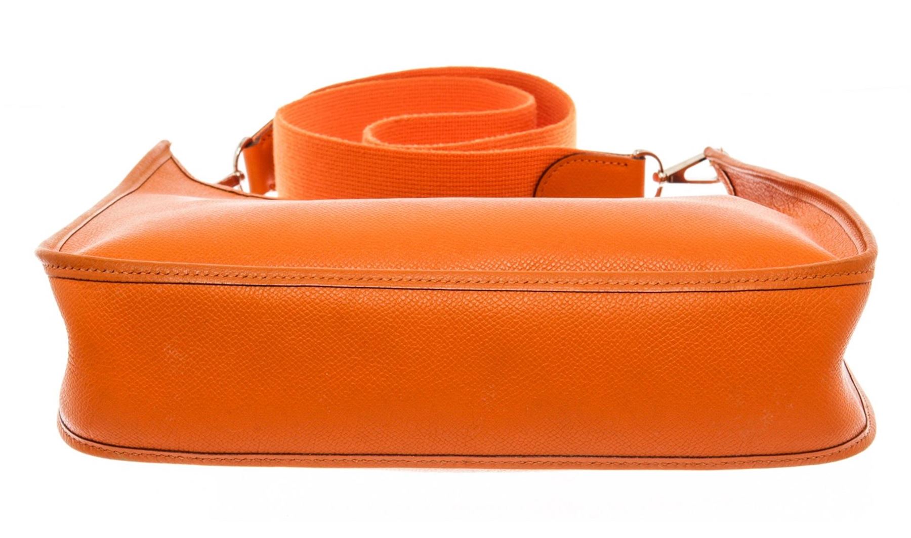 Hermes Orange Epsom Leather Evelyne GM Hobo Bag. All available information is listed in the description and shown in the photos. Hermes Orange Epsom Leather Evelyne GM Hobo Bag with orange d'h epsom leather, palladium-plated hardware, single adjustable shoulder strap, grosgrain & lasercut accents, single exterior pocket, suede lining, includes dust bag, snap closure at back. Height: 11" Width: 12" Depth: 2.5", Shoulder Strap Drop: 19.25" / 27.94 x 30.48 x 6.35 Cm