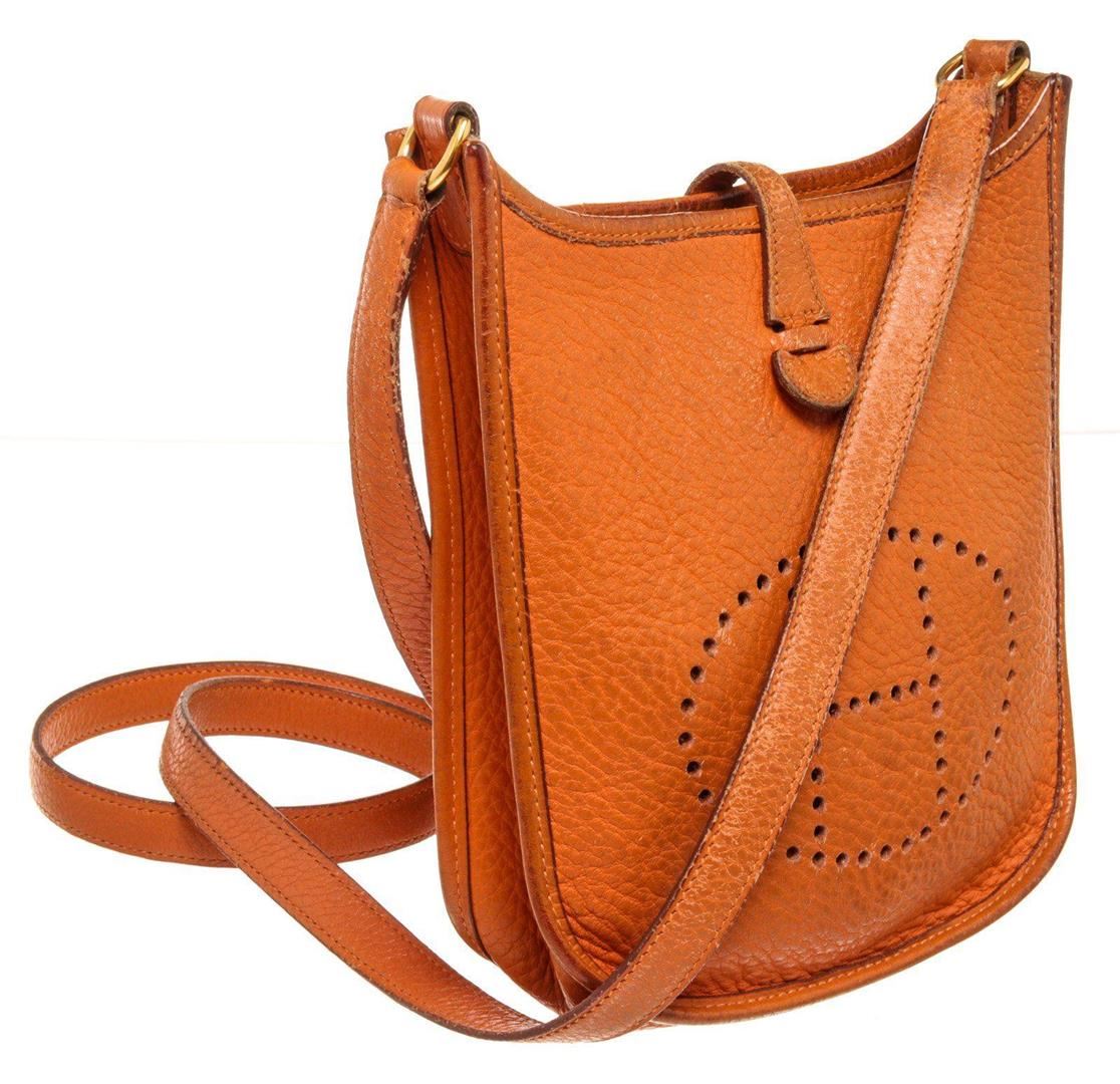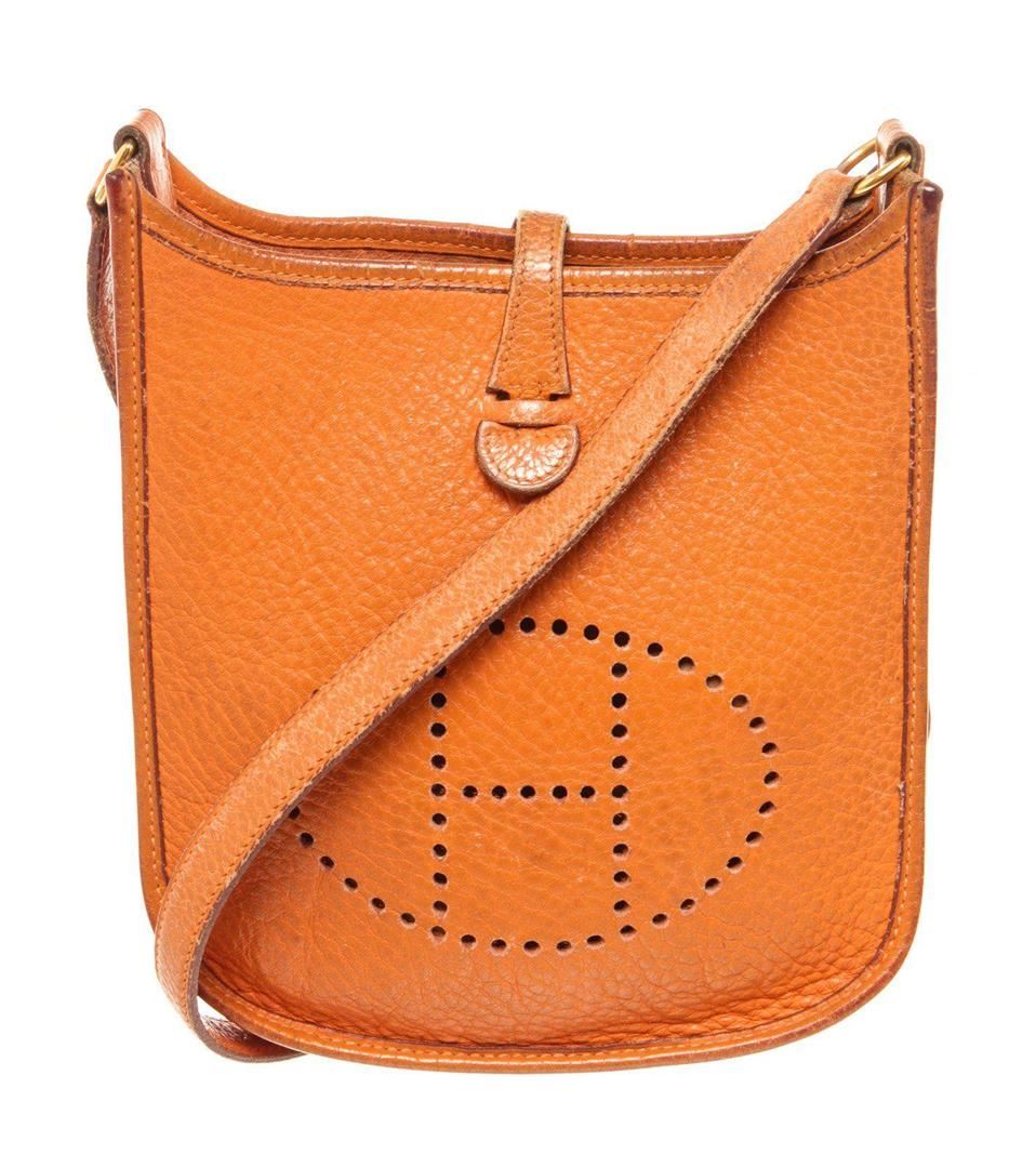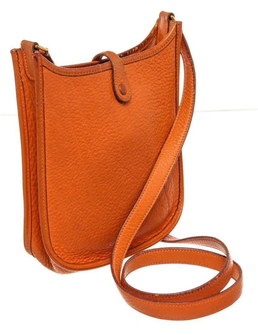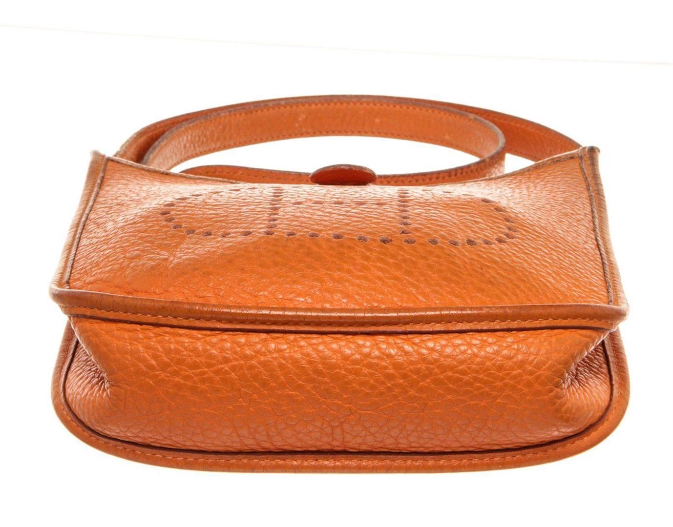 Hermes Orange Leather Evelyne 1 T PM Tote Bag with gold-plated hardware, single detachable flat shoulder strap, perforated logo at front, natural Barenia leather trim, tonal lining and snap closure at back.